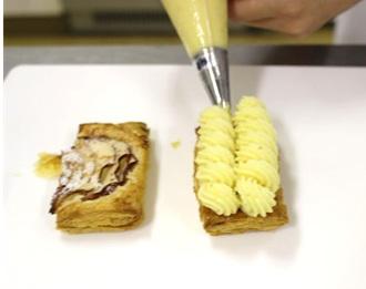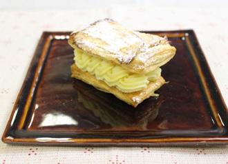 絞って、りんごののったパイシートをのせ、粉糖をふる。