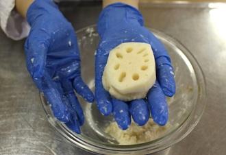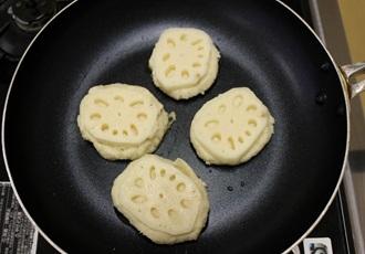 4等分にし、手で丸く成型し、片面に輪切りのれんこん
