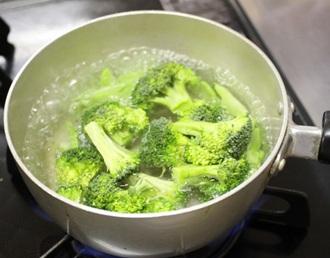 鍋に熱湯を沸かし、ブロッコリーをゆで、ざるに引き上げる。
