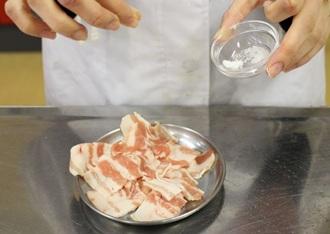 豚バラ肉は3~4cm長さに切り、塩、こしょうをする。