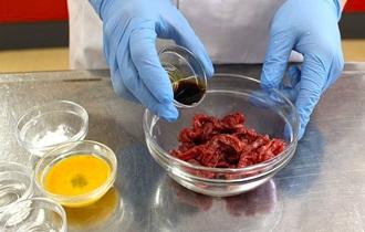 下味をつけた牛肉に片栗粉を加えて、混ぜ合わせる。