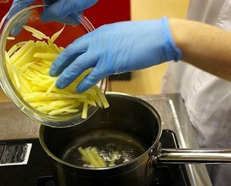 ピーマン、パプリカは種をとり、繊維にそって細切りにする。
