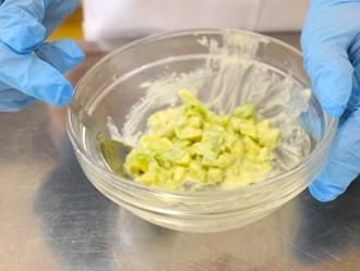 器に寿司飯を盛り、輪状に卵焼き、アボカド、きゅうり