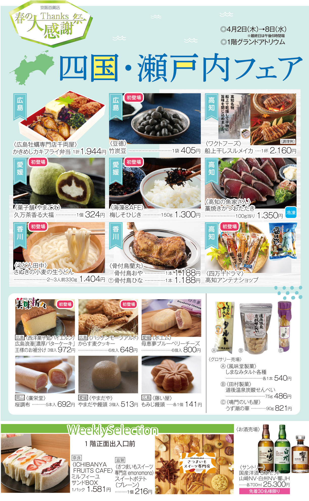 四国・瀬戸内の美味しさをお届けします!WeeklySelection(週替わりの催事)やウイスキーセットもお見逃しなく!ご来店お待ちしております。
