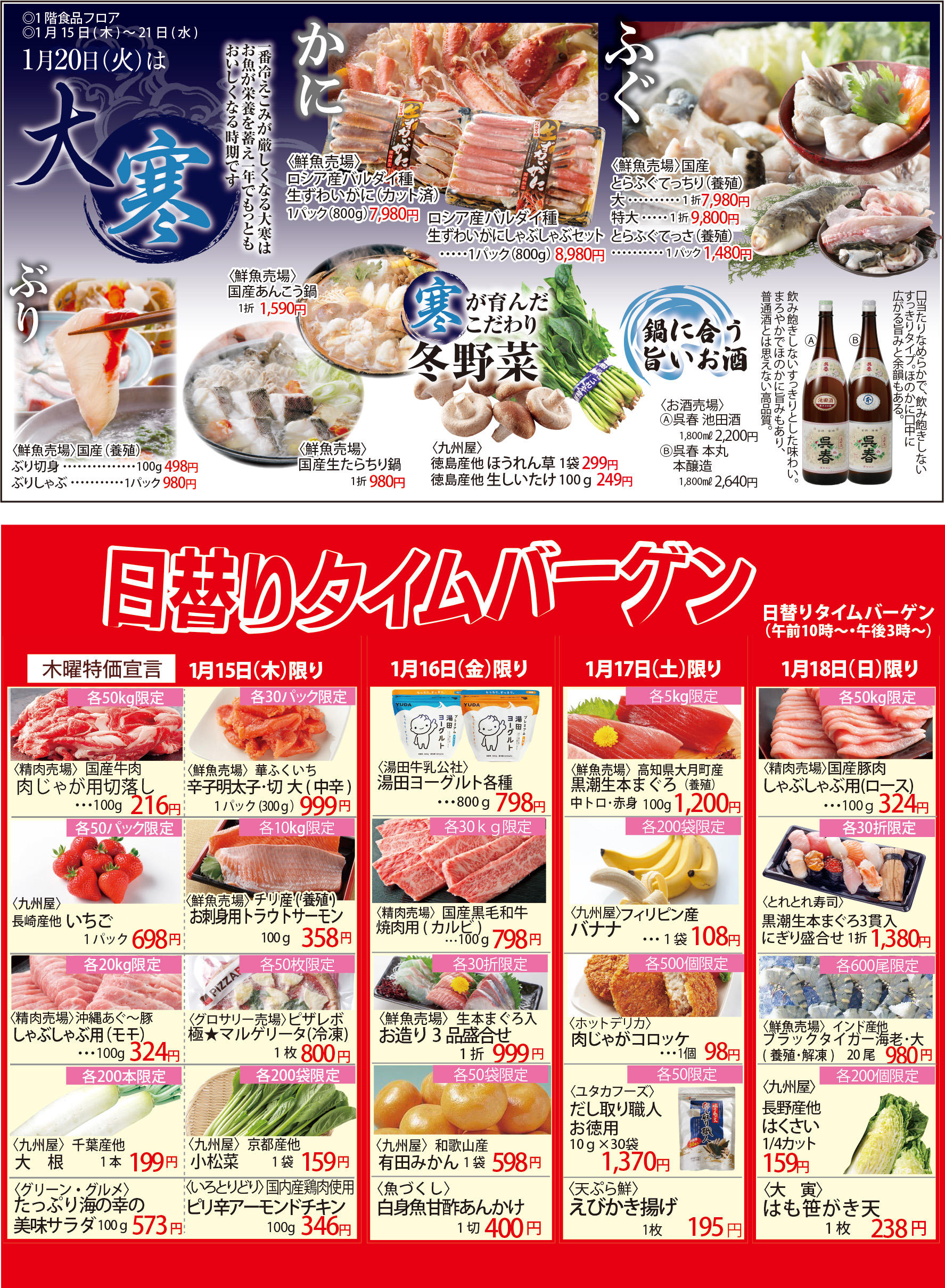 1月20日(火)は大寒です。一年で最も寒さが厳しくなる今の季節は美味しい魚・肉、ホットメニューで冬を楽しみましょう。日替りタイムバーゲンも開催です!