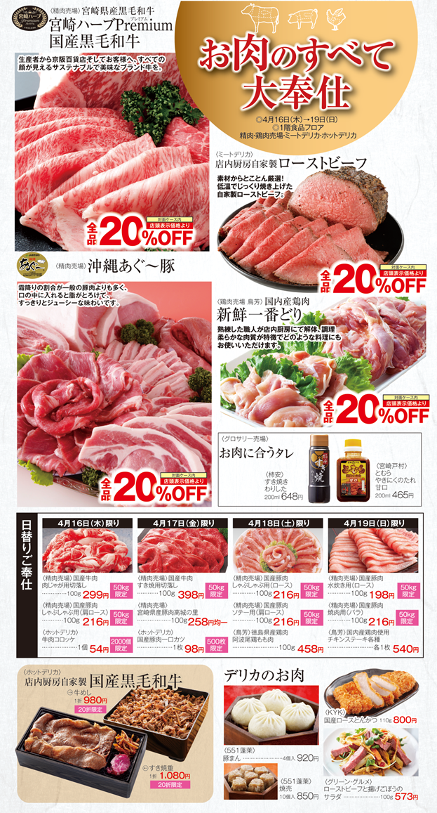お肉のすべて大奉仕開催!! 京阪自慢のおいしいお肉をお買得価格で!!デリカのお肉もぜひ!ご来店、お待ちしております
