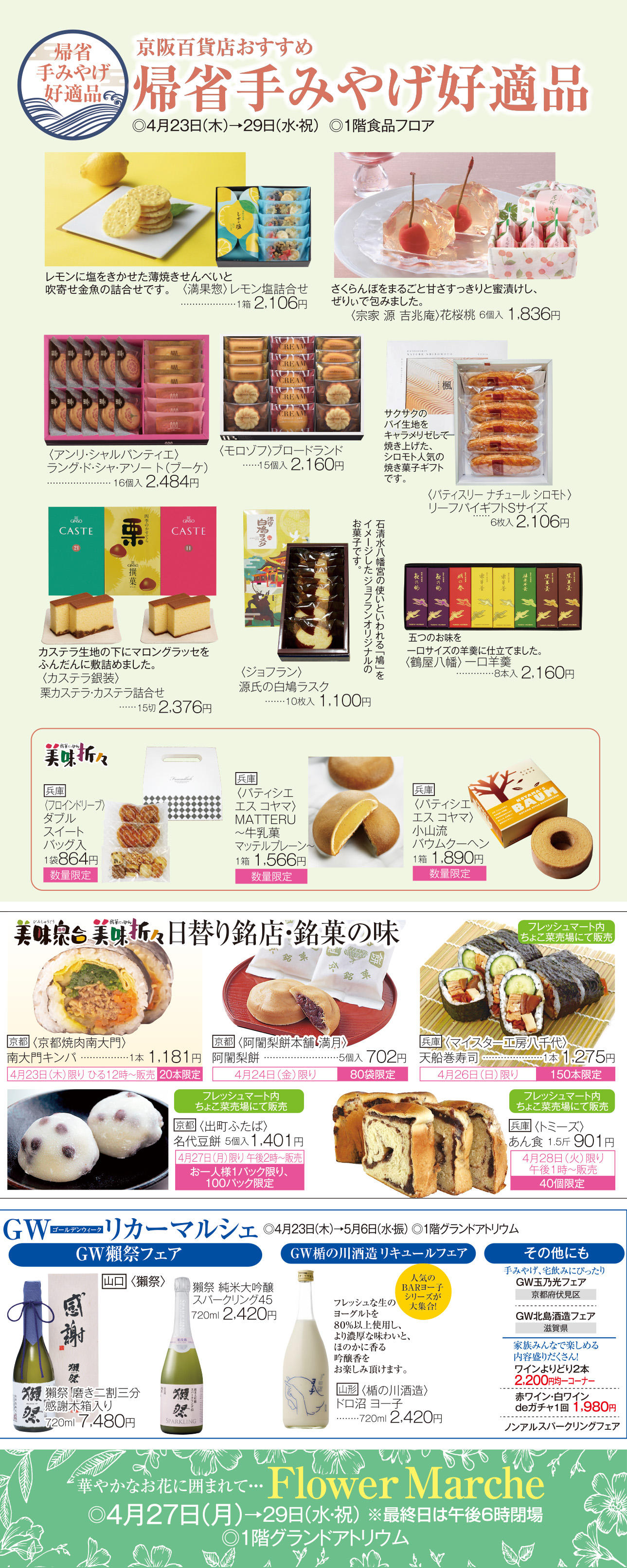 ゴールデンウイークに担当者おすすめの帰省手みやげのご紹介とリカーマルシェ&フラワーマルシェ開催美味衆合・折々の特別販売もお見逃しなく