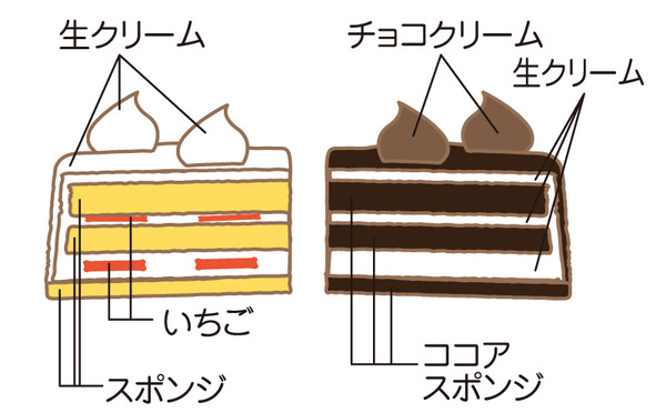 ▷生クリーム:生クリーム・スポンジ・国産いちご ▷チョコ:チョコクリーム・チョコガナッシュ・ココアスポンジ・生クリーム
