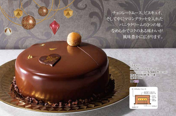 「ガトー オ ショコラ エマロン」(限定40台・賞味期限製造日より1日) 価格:5,940円(税込) 大きさ:4号 ▷おすすめポイント チョコレートムース、ビスキュイ、そして中央にはマロングラッセが入ったバニラクリームの3つの層。なめらかでコクのある味わいが風味豊かに広がります。