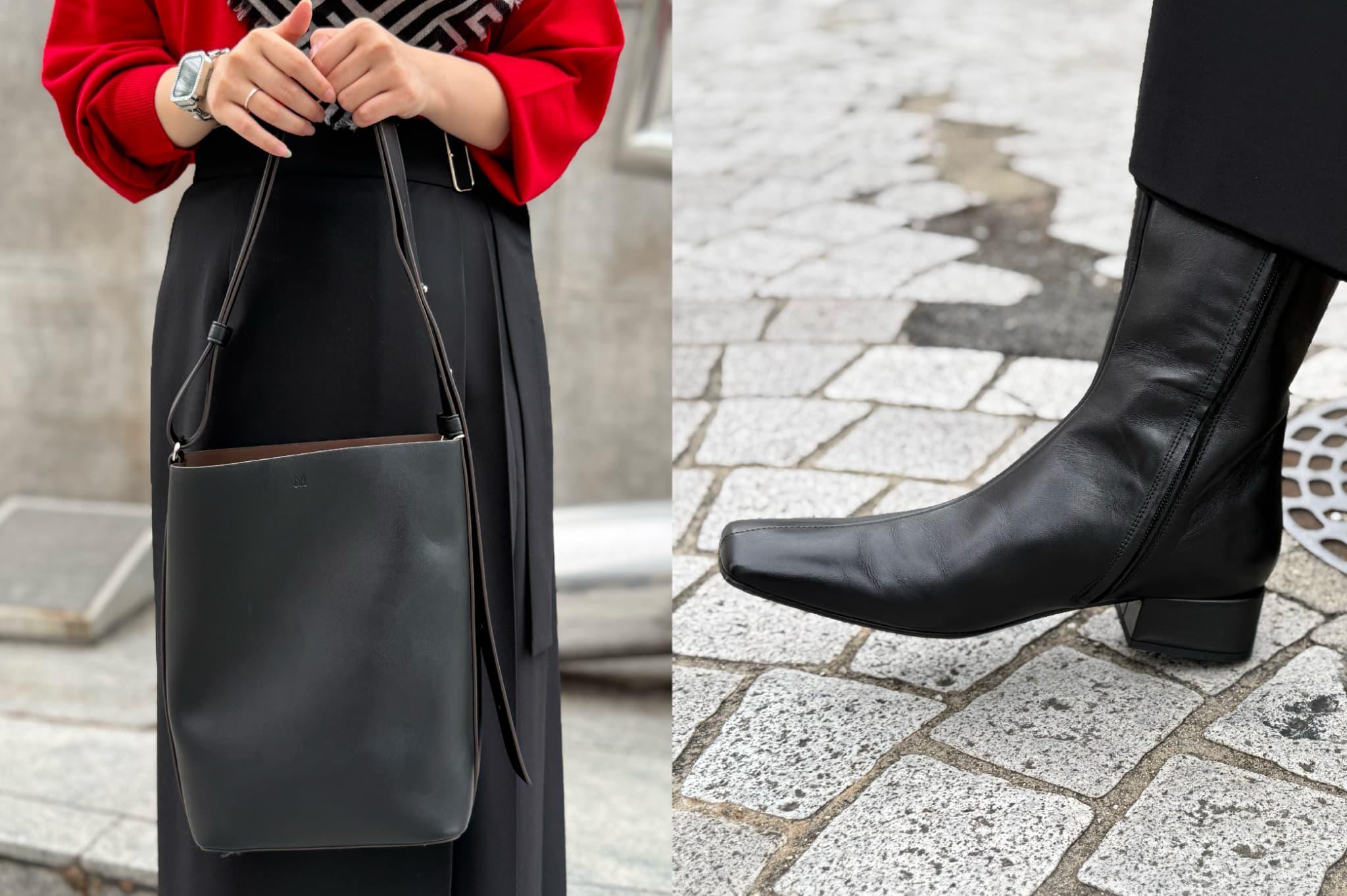 - 黒で統一されたシックなコーディネートの中に赤のワンポイントで一気に華やかな印象に。首元の大判ストールは肩にかけて、温度調節のアイテムとしてお使いいただけます。※ブーツは参考商品