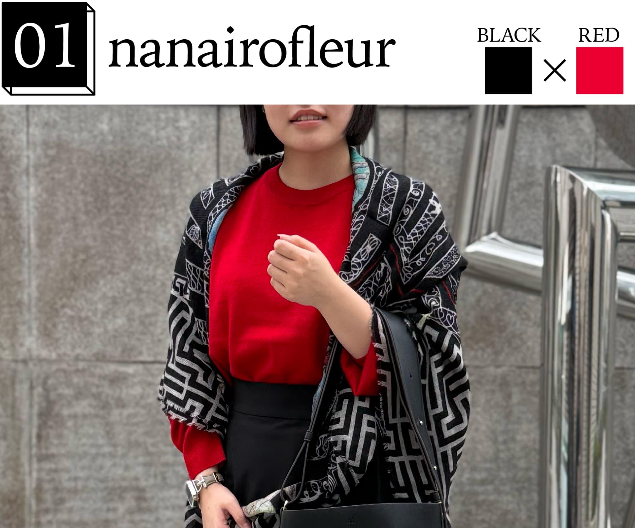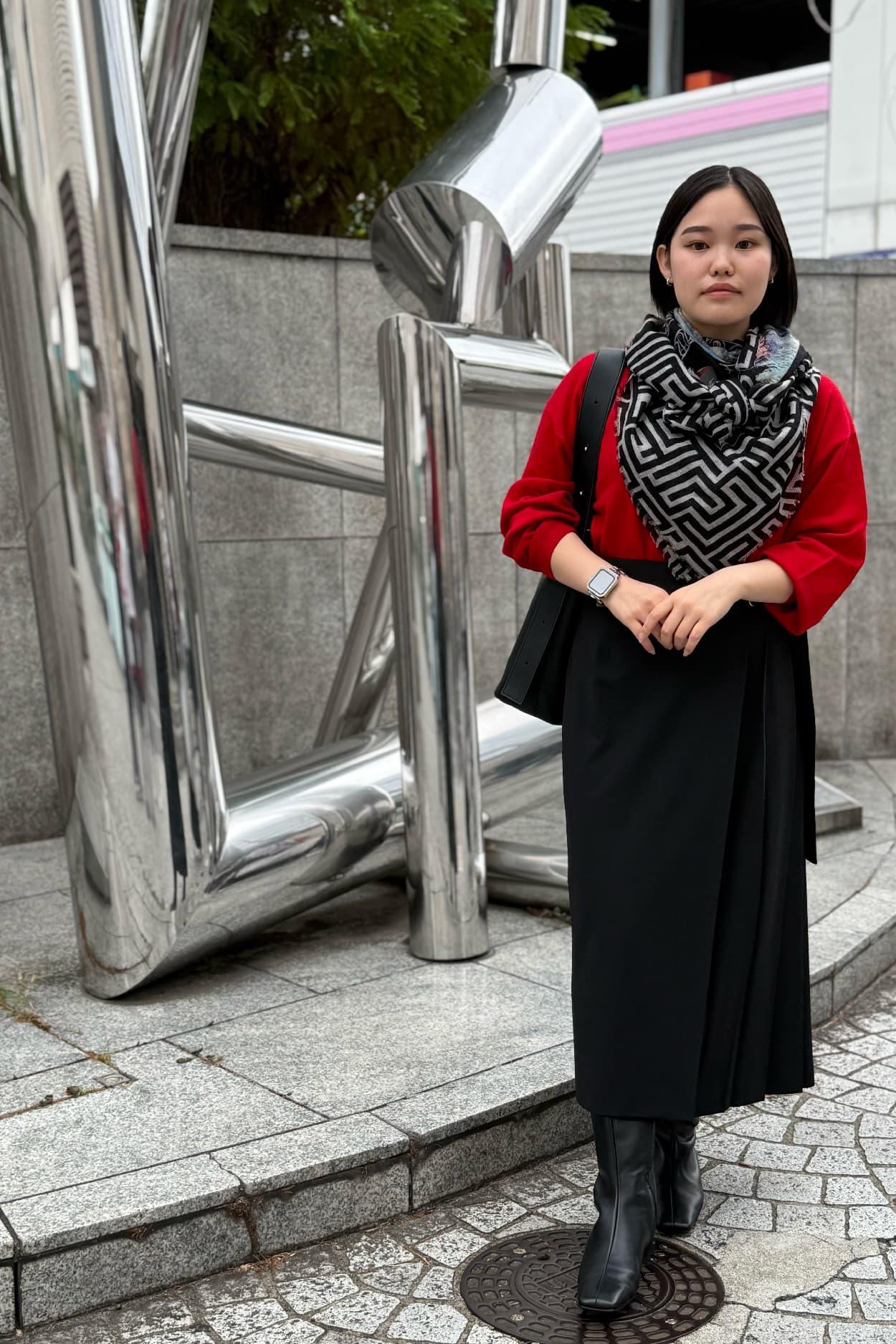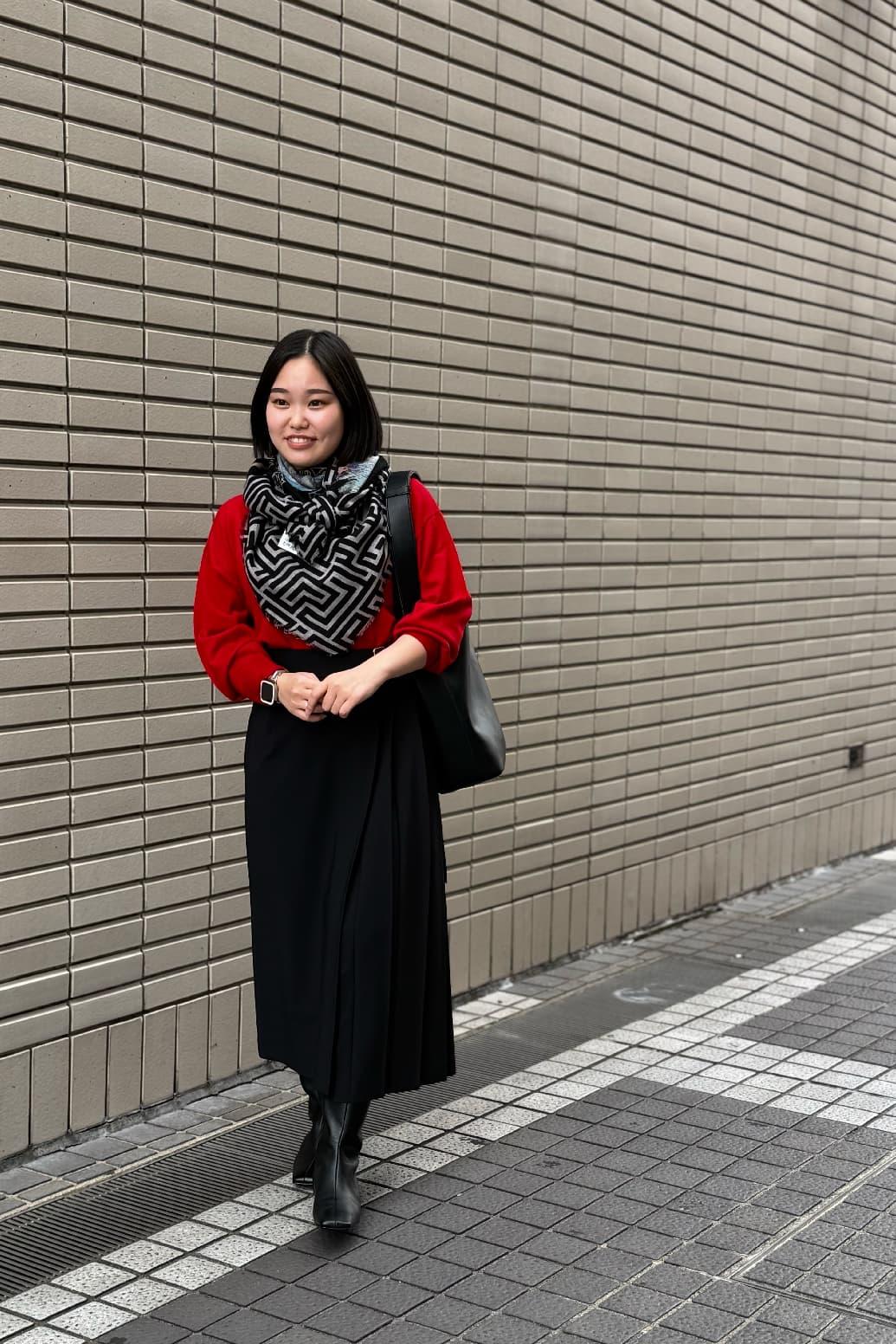 - 黒で統一されたシックなコーディネートの中に赤のワンポイントで一気に華やかな印象に。首元の大判ストールは肩にかけて、温度調節のアイテムとしてお使いいただけます。※ブーツは参考商品