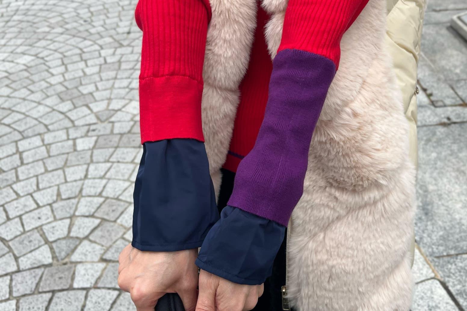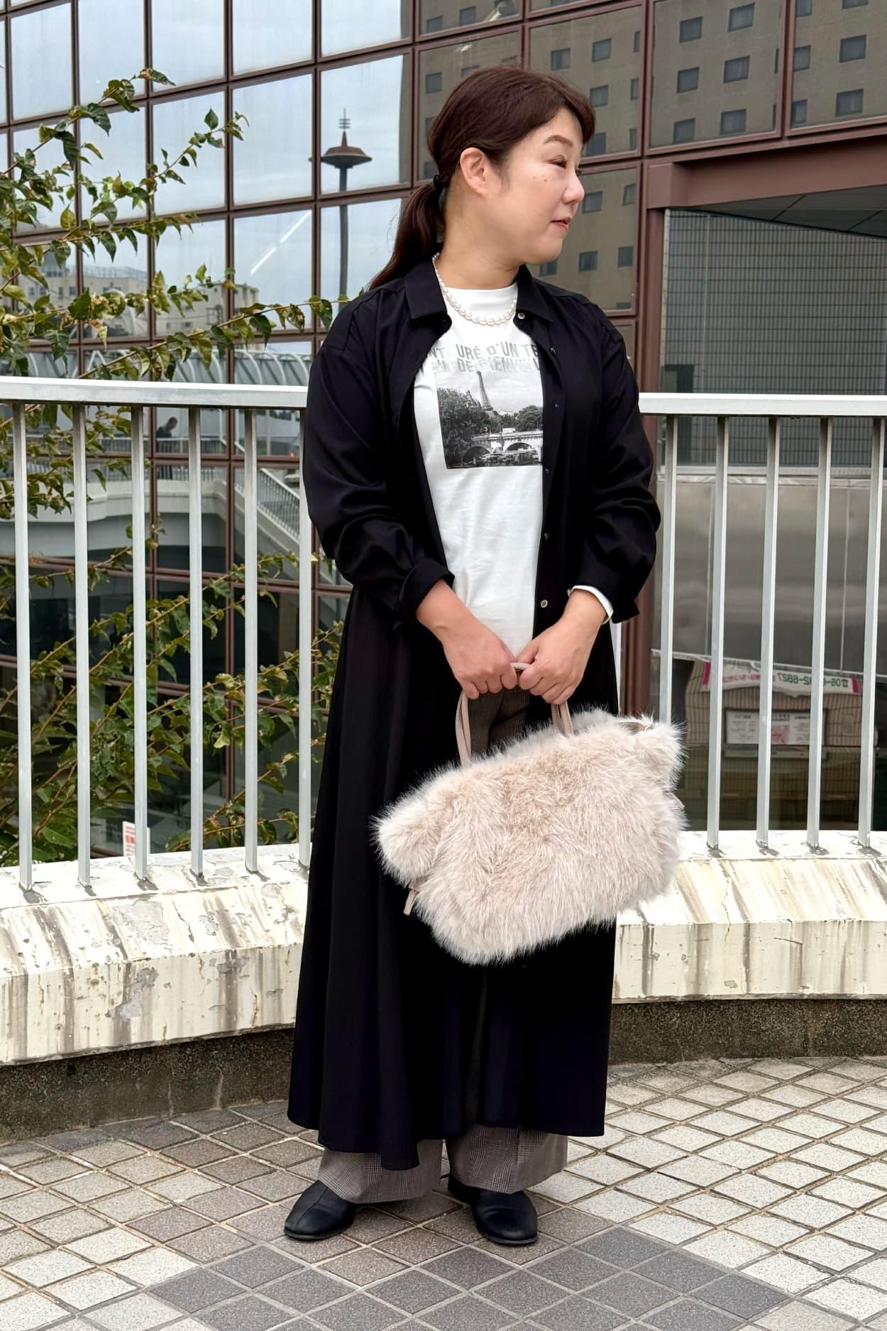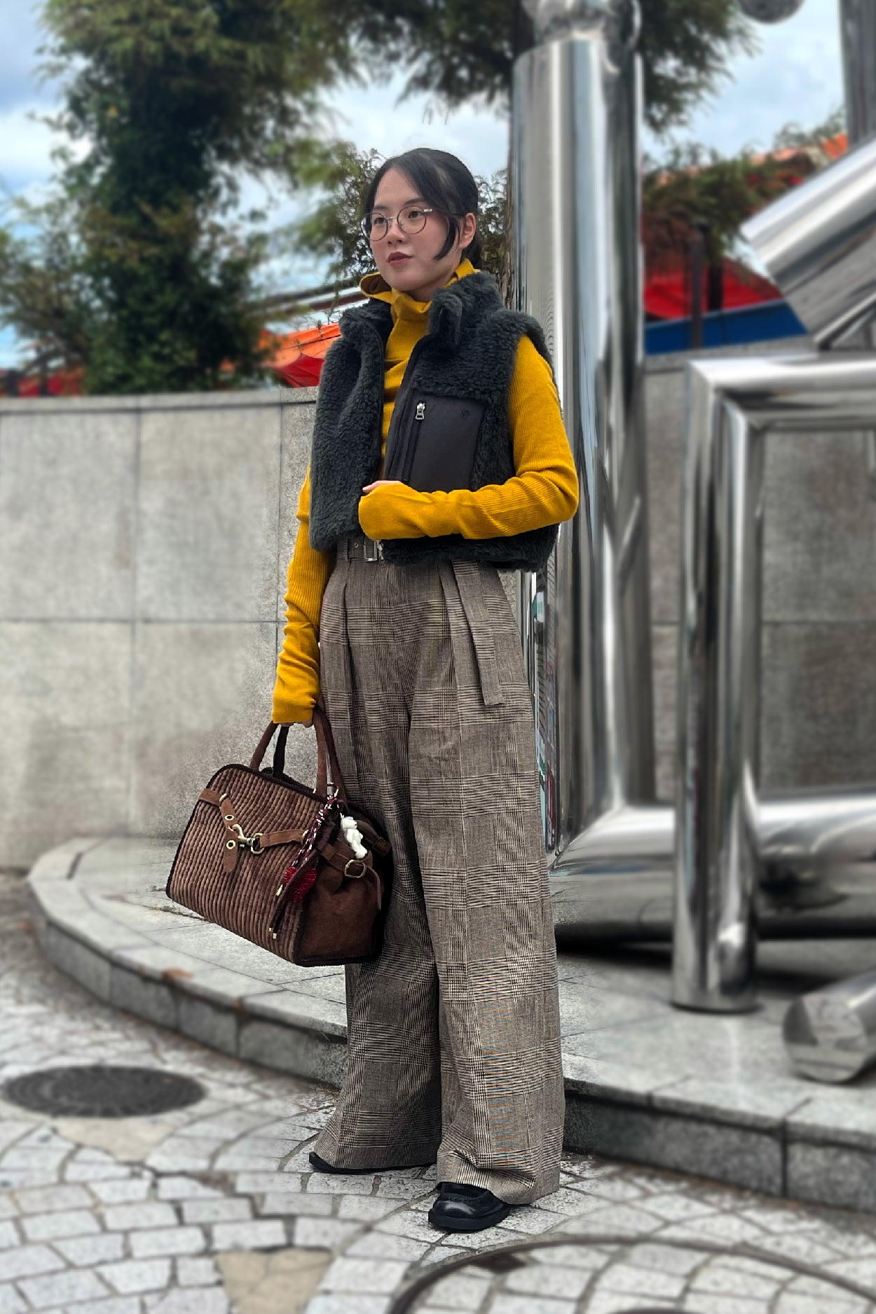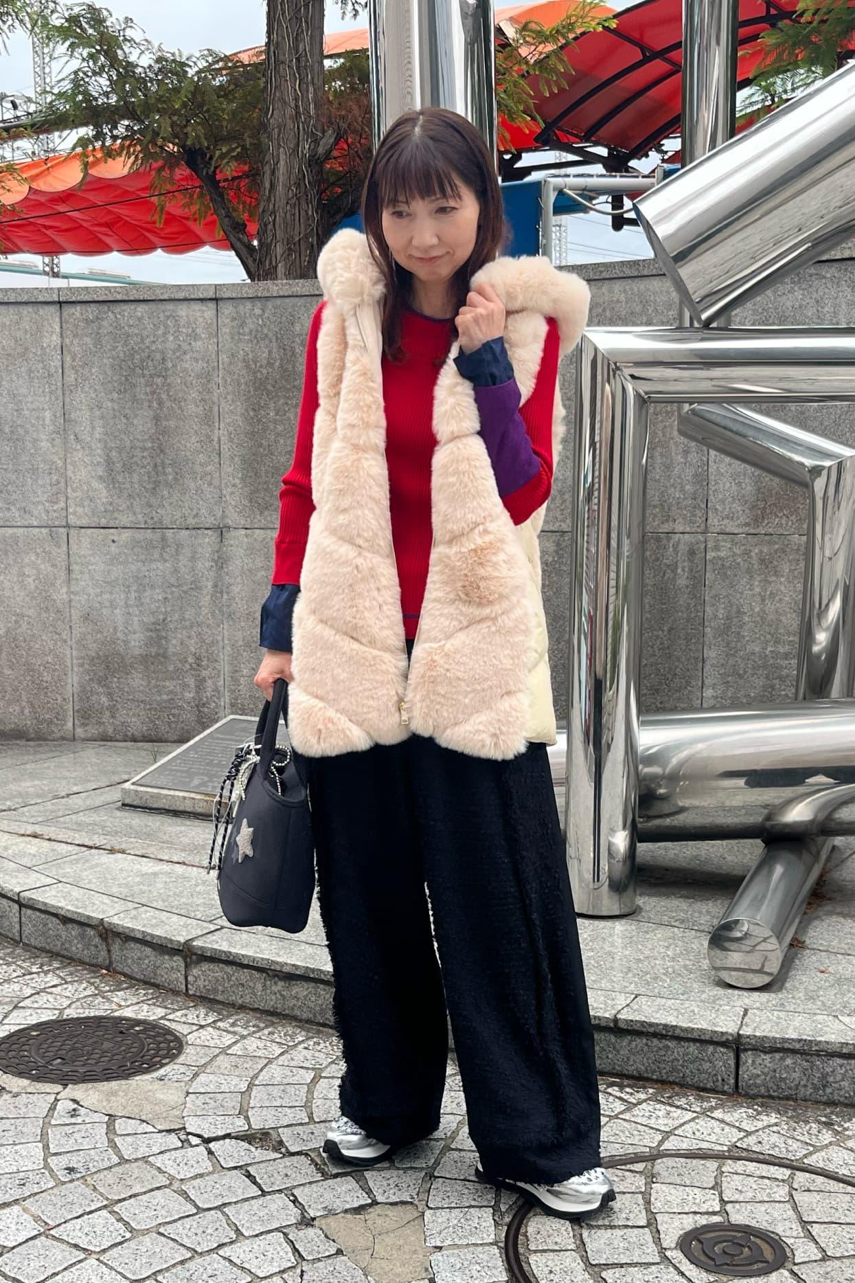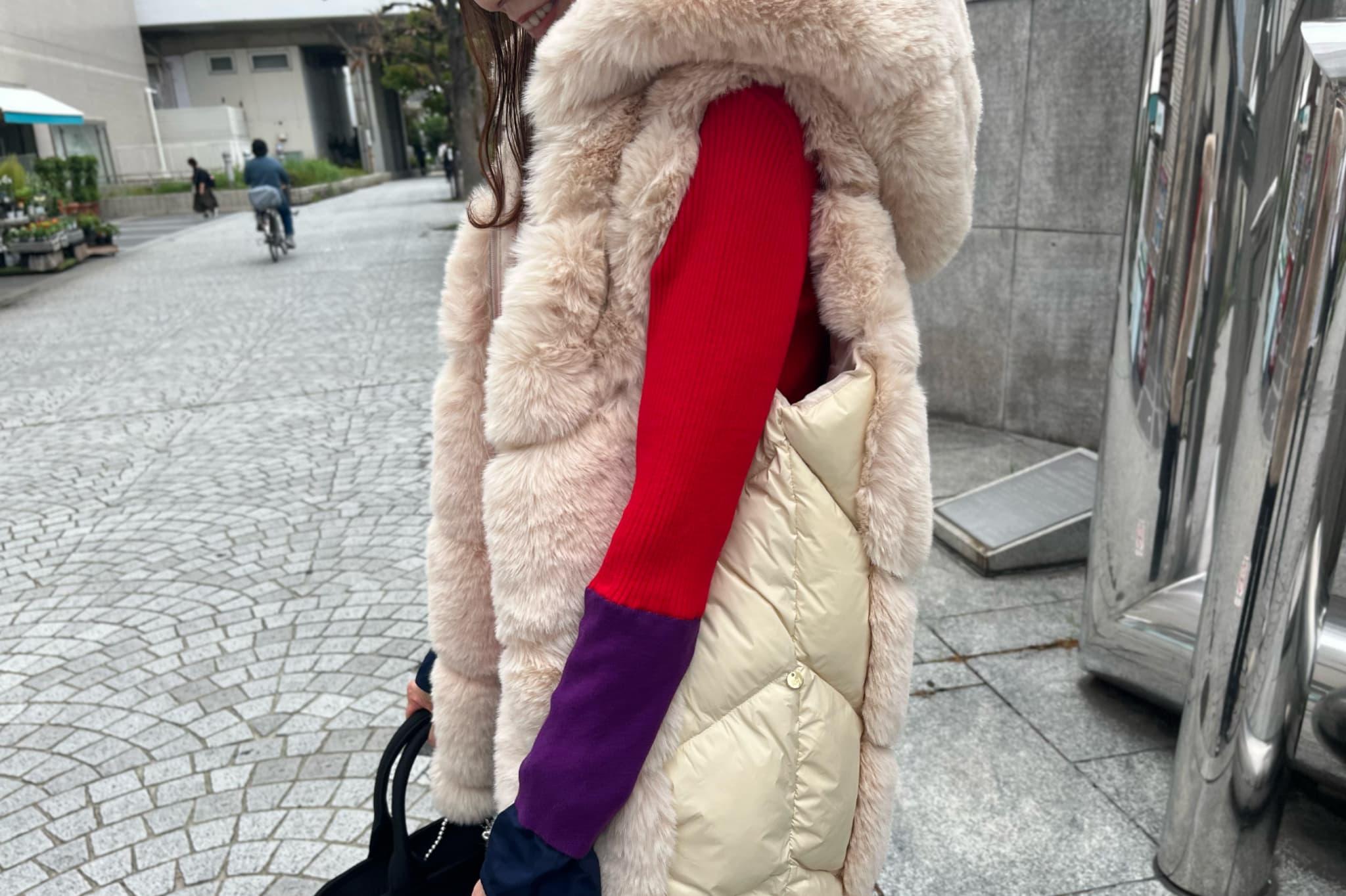- お出かけしやすくなるこの季節は、薄手のカラーニットにボアベストを重ねてカジュアルな着こなしに。ニットはフード付きで重ね着するとワンポイントアイテムとしてお使いいただけます。バッグには今年流行のキーチャームをつけて、その日の気分で付け替えて遊び心をプラス。