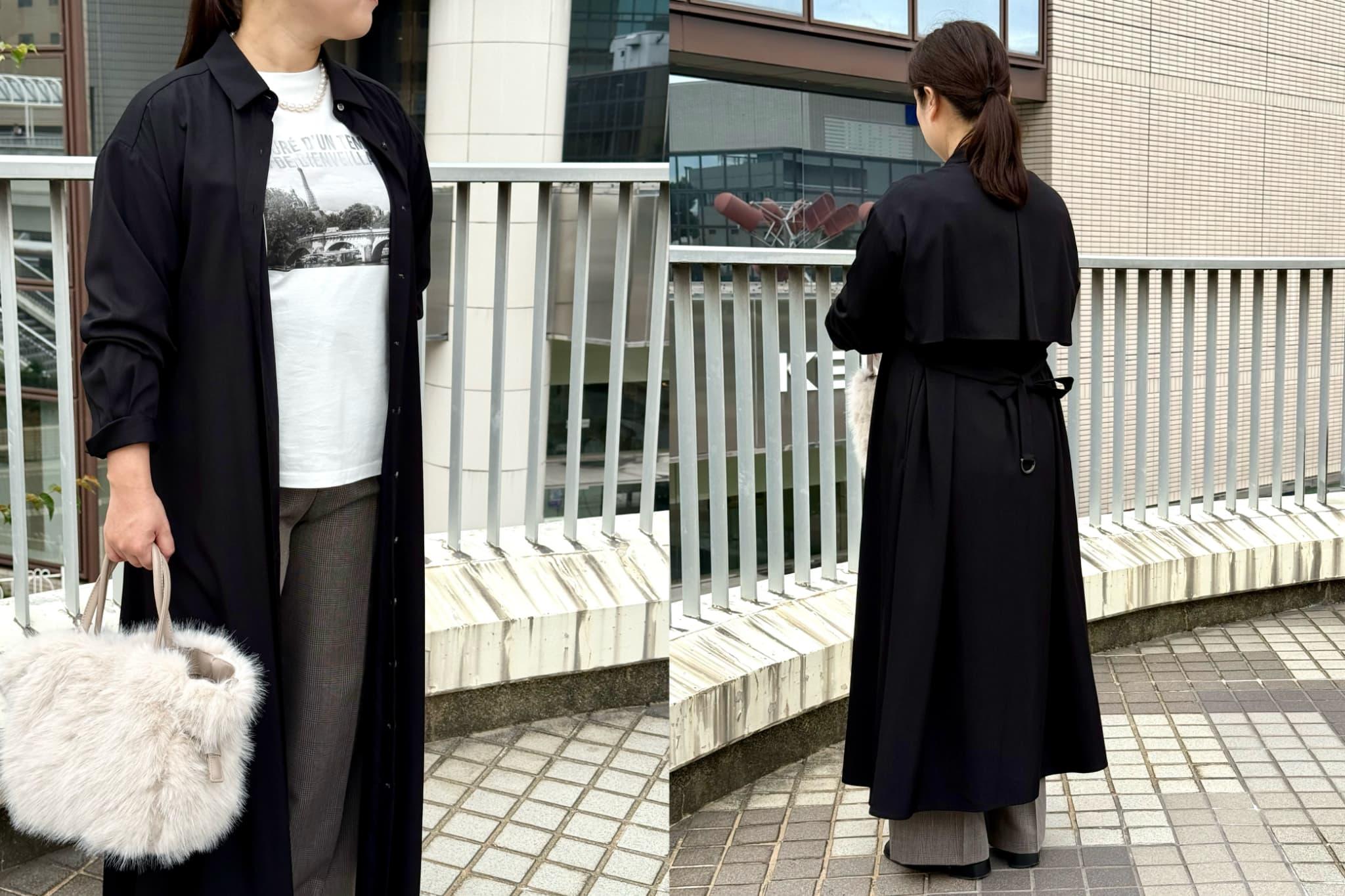 - ワンピースとしても便利な2WAYトレンチ風コート。いつものスタイルにこれ1枚羽織るだけで、通勤にも普段のカジュアルスタイルにもバッチリ決まるこの秋イチオシコーデです♪
