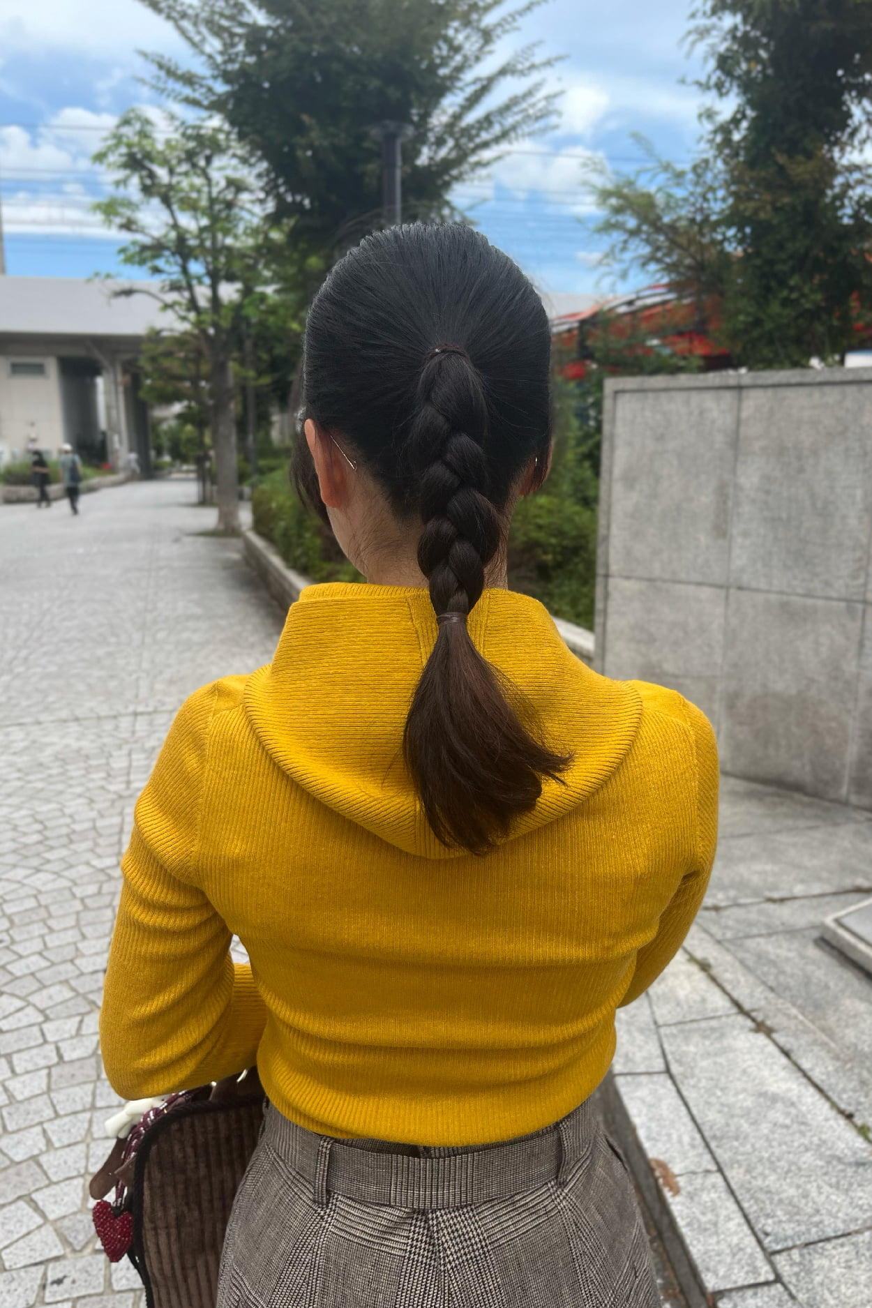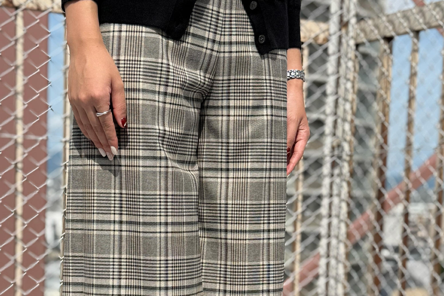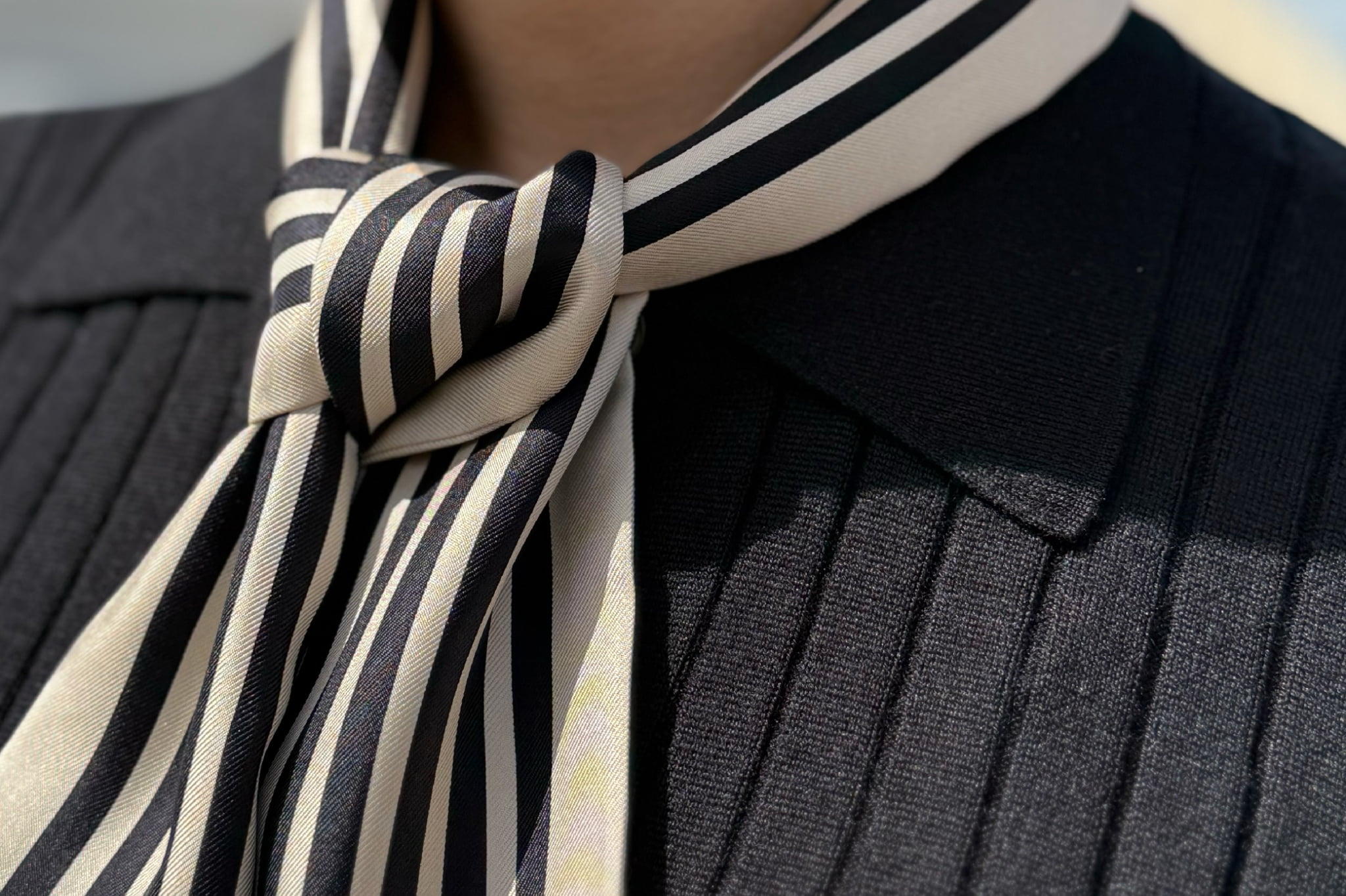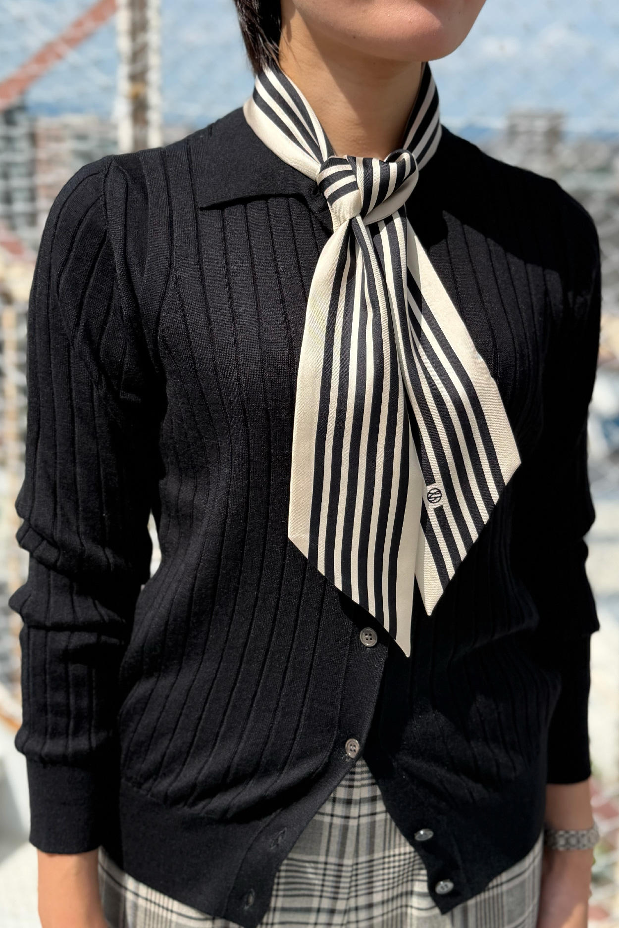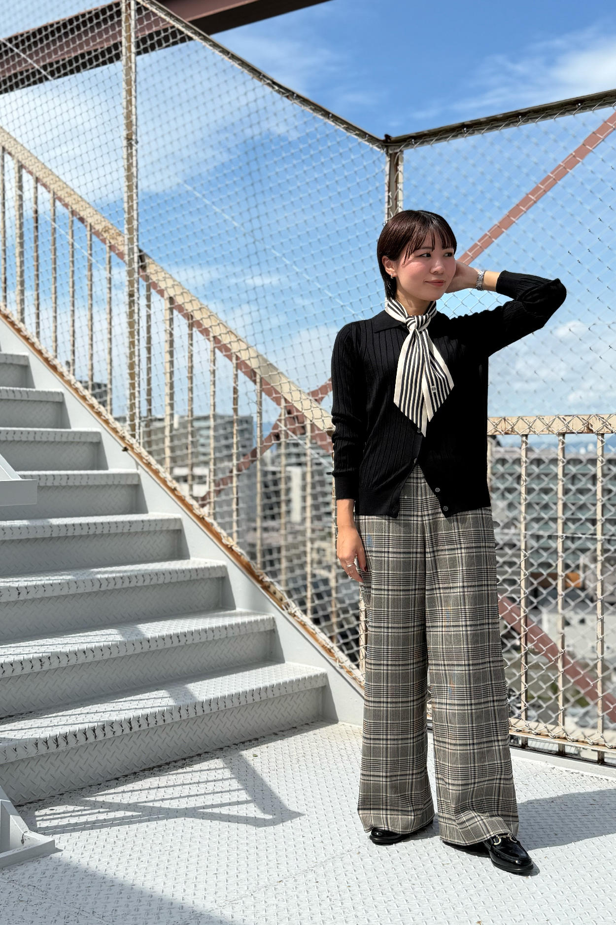 - 毎年定番のSLOANEのリブニットにチェックパンツを合わせたシックなコーディネート。ニットは、ウールとシルクの混合素材で柔らかい着心地が特徴です。顔まわりが暗くならないよう、スカーフを取り入れて華やかな印象に仕上げました。
