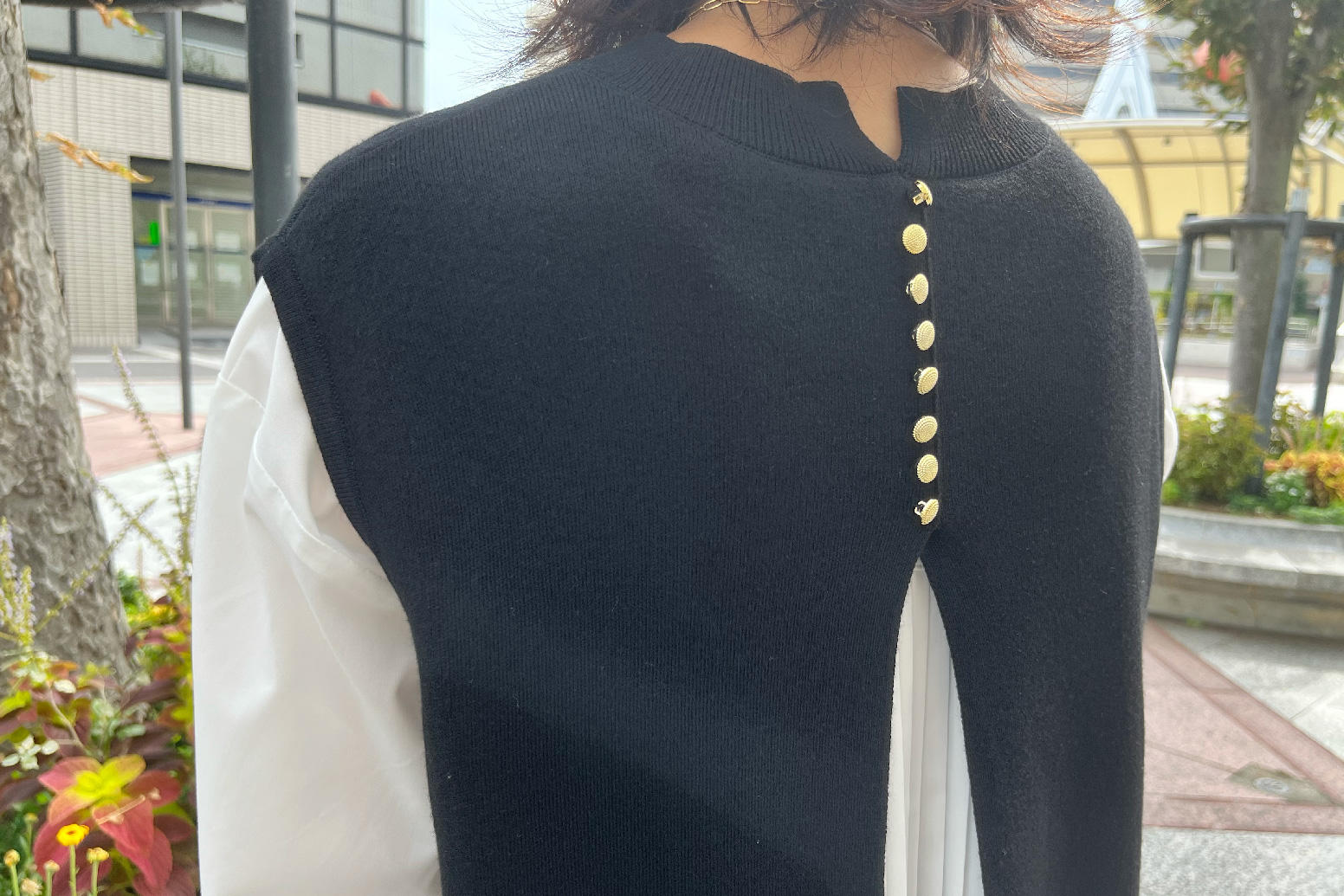- バックスタイルのボタンが目を惹く、ニットと背中のプリーツが印象的なブラウスのセットアイテム。セットで着るだけでコーディネートが完成する優れもの。単品でも手持ちのアイテムとのレイヤードでも楽しめるので、コーディネートの幅が広がります。