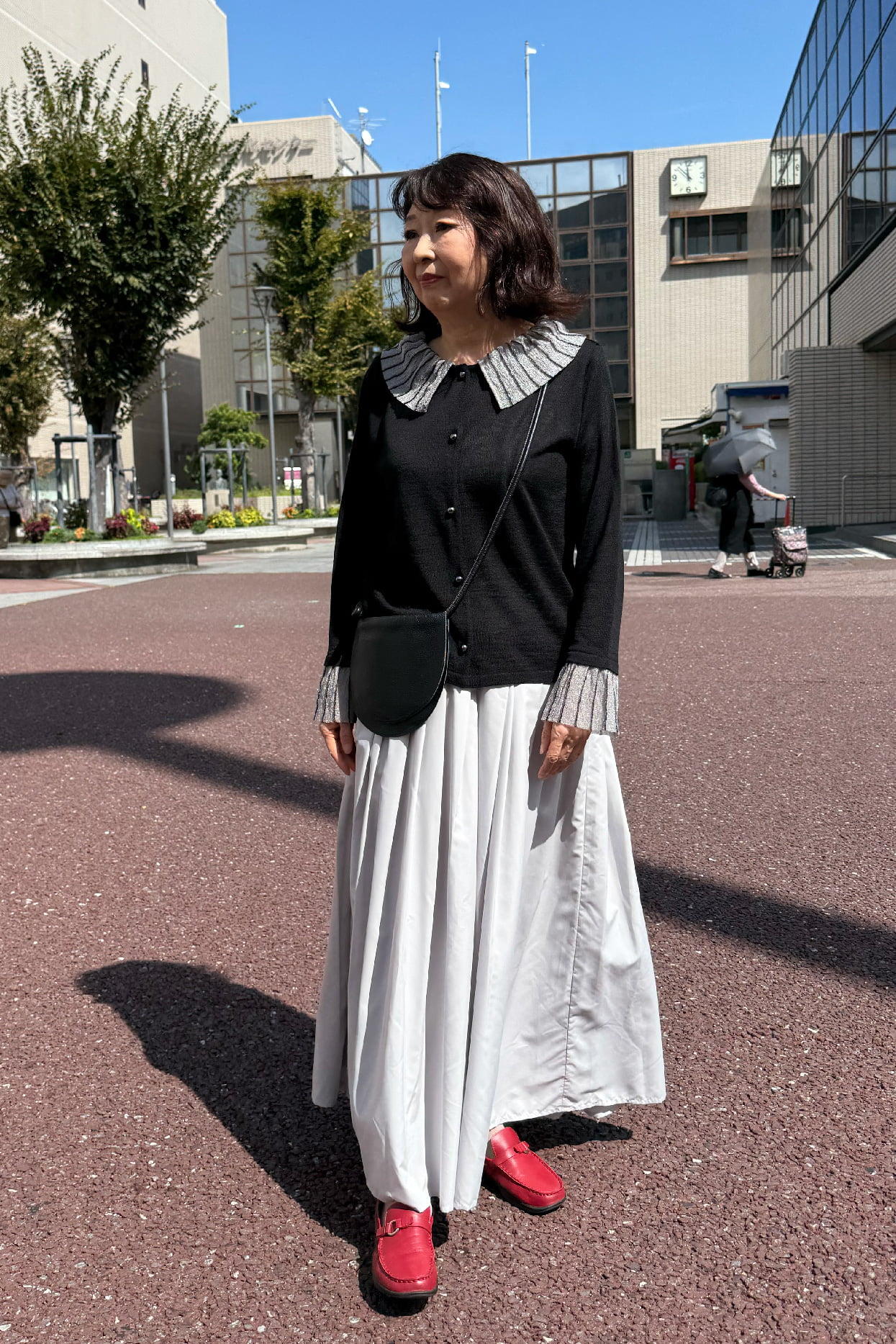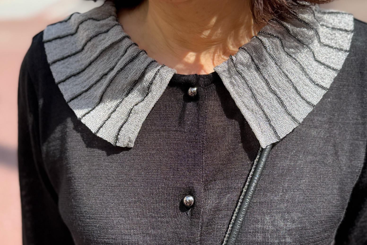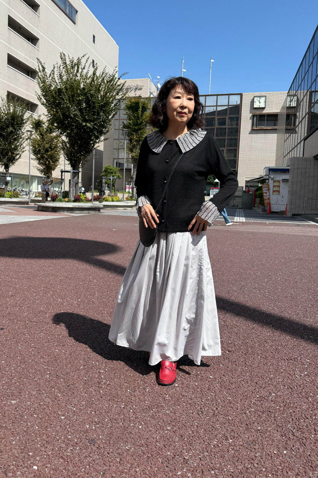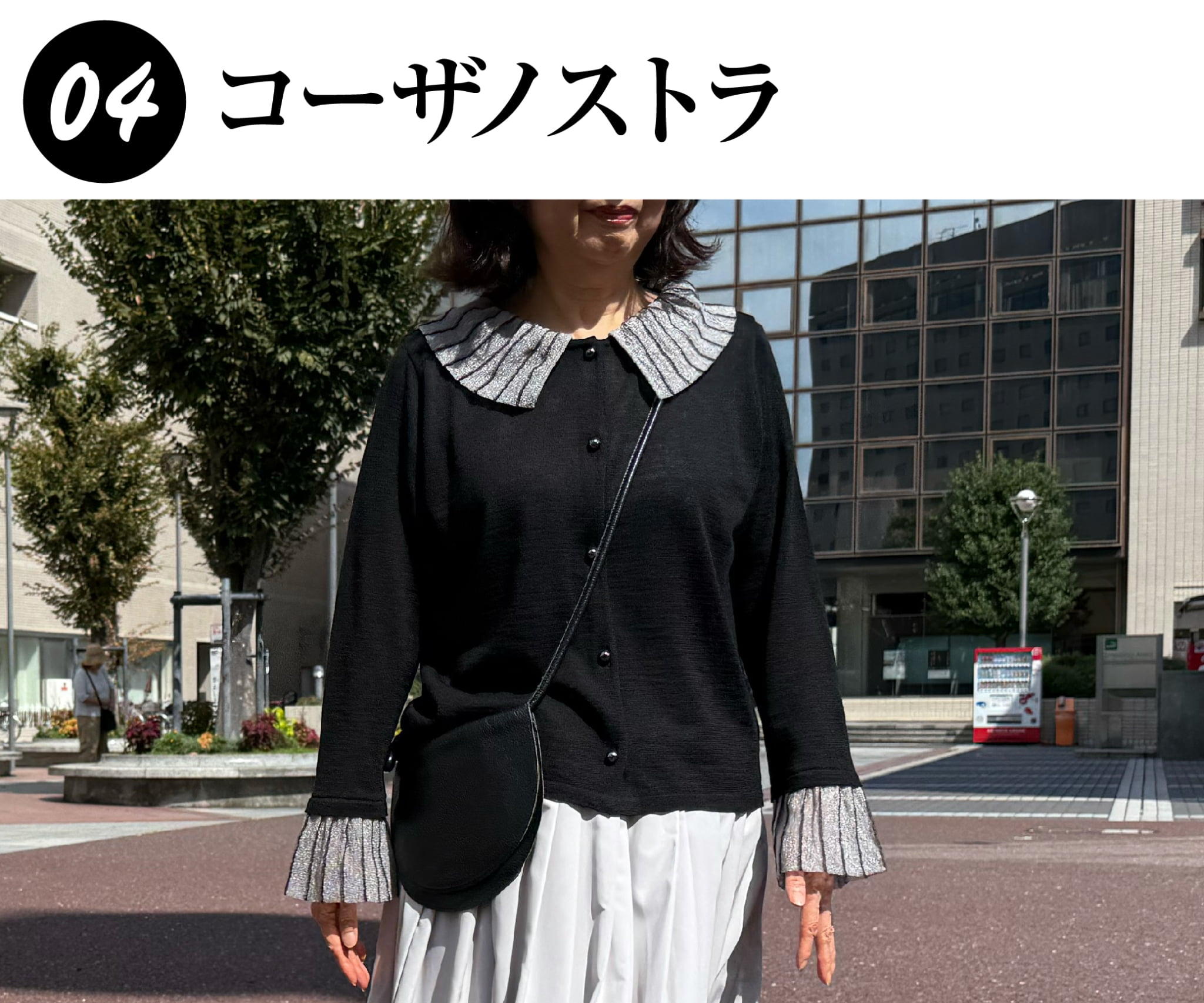 - バロック調をテーマにした襟元と袖部分に特徴あるニットにハリと光沢感のあるスカートをあわせ女性らしさをアップ。