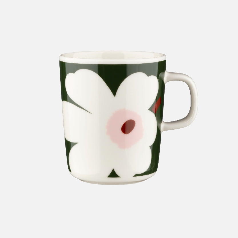 …………………… (税込)4,180円 - 花をモチーフにしたUnikko柄が卓上で存在感を放つ日本限定のマグカップ250mlサイズ。ホワイトとダークグリーンをベースに、愛らしいライトピンクをアクセントにプラスしています。小ぶりな持ち手のデザインフォルムがスタイリッシュな印象です。