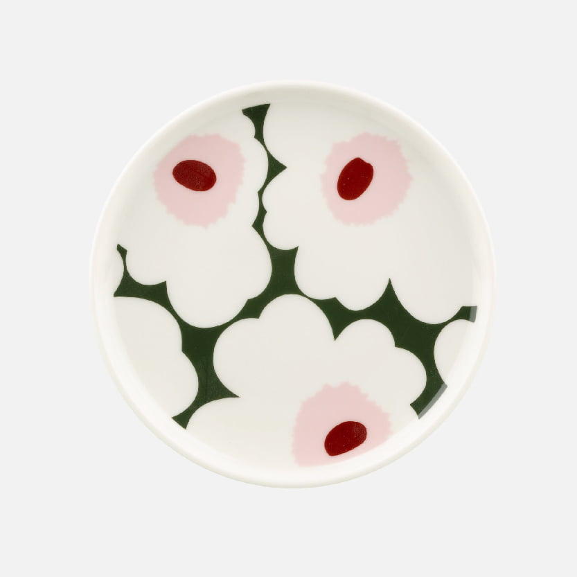 …………………… (税込)4,180円 - 花をモチーフにしたUnikko柄が卓上で存在感を放つ日本限定のプレート。フチが少し高くなった丸型フォルム。小ぶりな13.5cmサイズは使い勝手が良く、前菜やスイーツなどの取り分けにも活躍。ホワイトとダークグリーンをベースに、愛らしいライトピンクをアクセントにプラスしています。