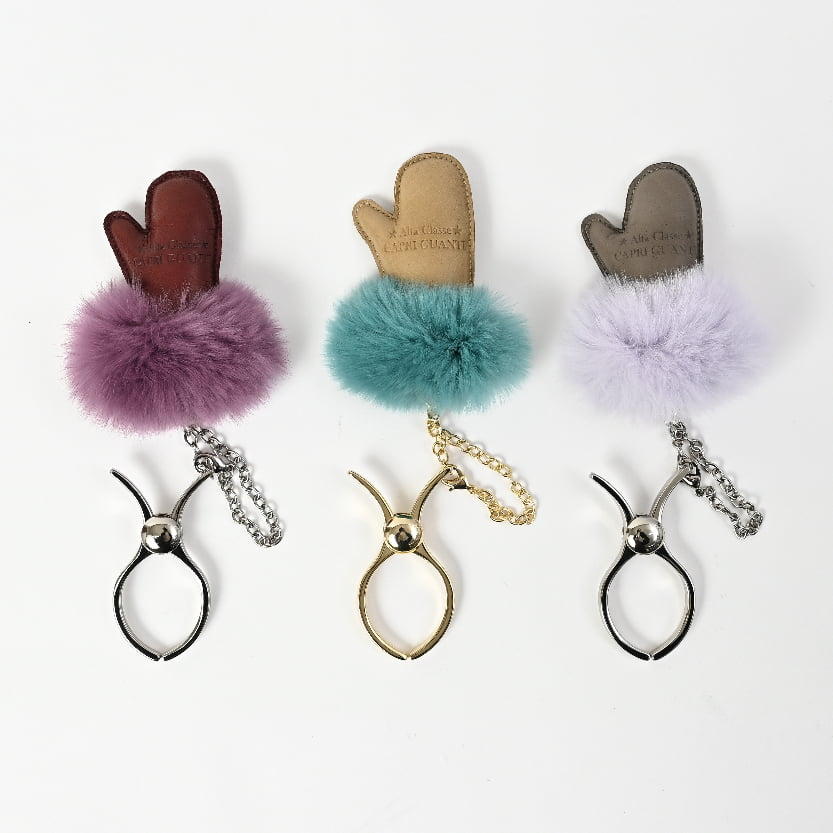 …………………… (税込)各6,600円 - 羊革で出来た小さな手袋にラビットファーをあしらい、 手袋をかわいくバッグに携帯できるクリップタイプのグローブホルダー。グローブとのコーデを楽しめるので、セットでプレゼントするのもおすすめです。