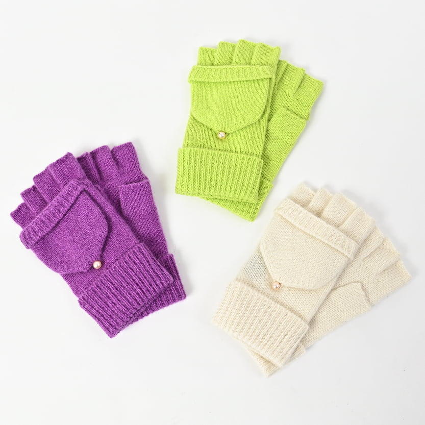 …………………… (税込)各11,000円 - カシミヤ100%で、柔らかく暖かい肌触りが魅力のグローブ。丸みのあるかわいいミトンカバーはパール調ボタンで固定でき、スマホ操作などにも邪魔にならず機能的です。鮮やかなカラー展開で、寒い冬の手元を華やかに彩ります。