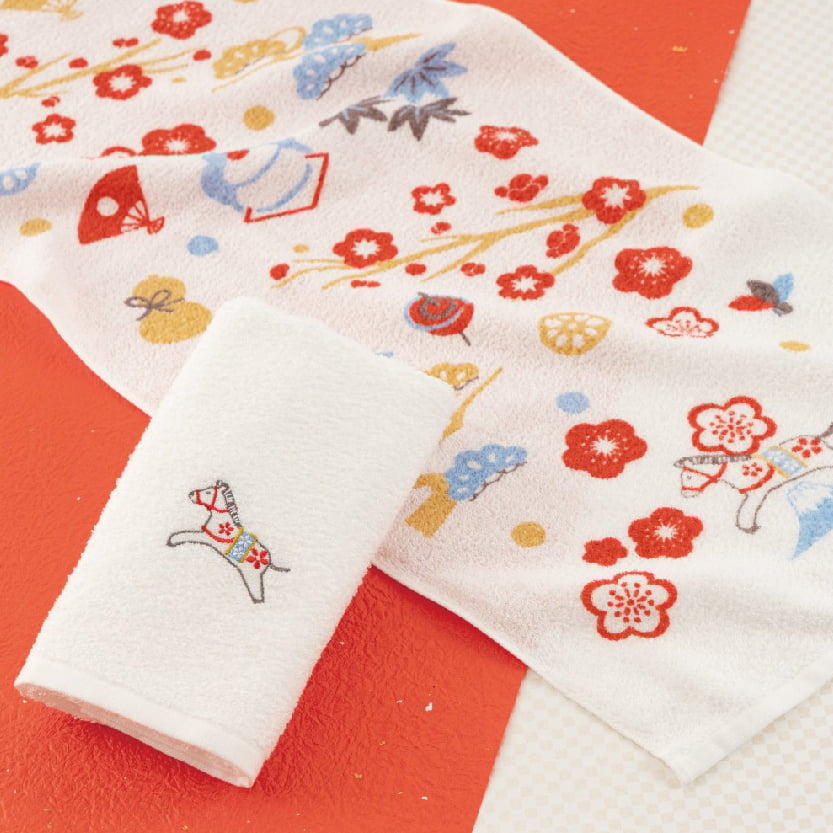 …………………… (税込)各660円 - 成功や進展、繁栄を象徴する跳ね午をモチーフにしたワンポイント刺繍の「午」と、プリント柄の「跳ね午」の干支タオル。飛躍の年になるよう願いを込めた縁起の良いお年賀タオルです。