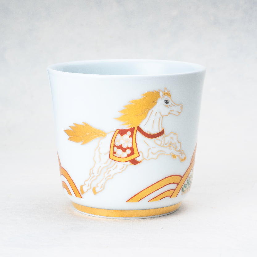…………………………… (税込)11,000円 - 令和8年干支「午」をモチーフに、運気の高まりを象徴する白馬が天へと力強く翔る姿を表現し白馬の足元には、縁起の良い西海波を配し、波間に伝統的な吉祥柄を施すことで、さらなる福を重ねる構図に仕上げました。このロックカップは、磁器ならではの滑らかな質感と優しい口当たりが特徴です。冷酒や焼酎を飲む際に氷がたっぷり入れられるように、口が広く作られています。ご自分用としてはもちろん、午年の方にも末永い幸せを願い心に残る贈り物はいかがですか。
