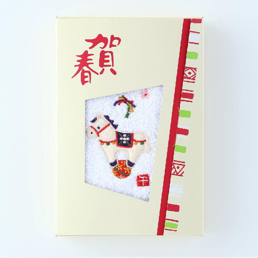 シンプルながらも華やかさを感じさせる白馬の刺繍が、新年のギフトにぴったりなデザインです。年始のご挨拶におすすめの商品です。