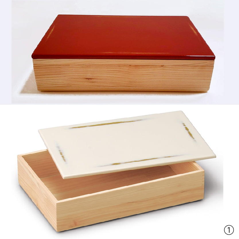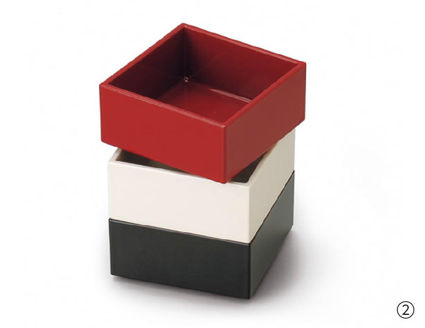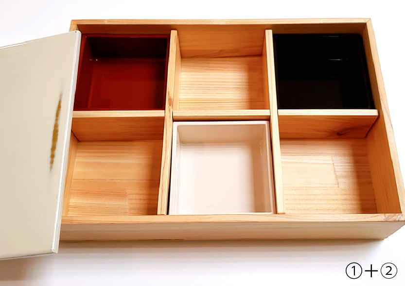 ①仕切りと小鉢をセットして、6マスのおせち重が完成。ひとり用のおもてなし重としても、仕切りを使わずちらし寿司やおにぎりを入れて行楽やアウトドアにも。紀州塗のシンボル、根来塗をアレンジした蓋は、皿としても使え、季節に応じた料理箱として活躍します。