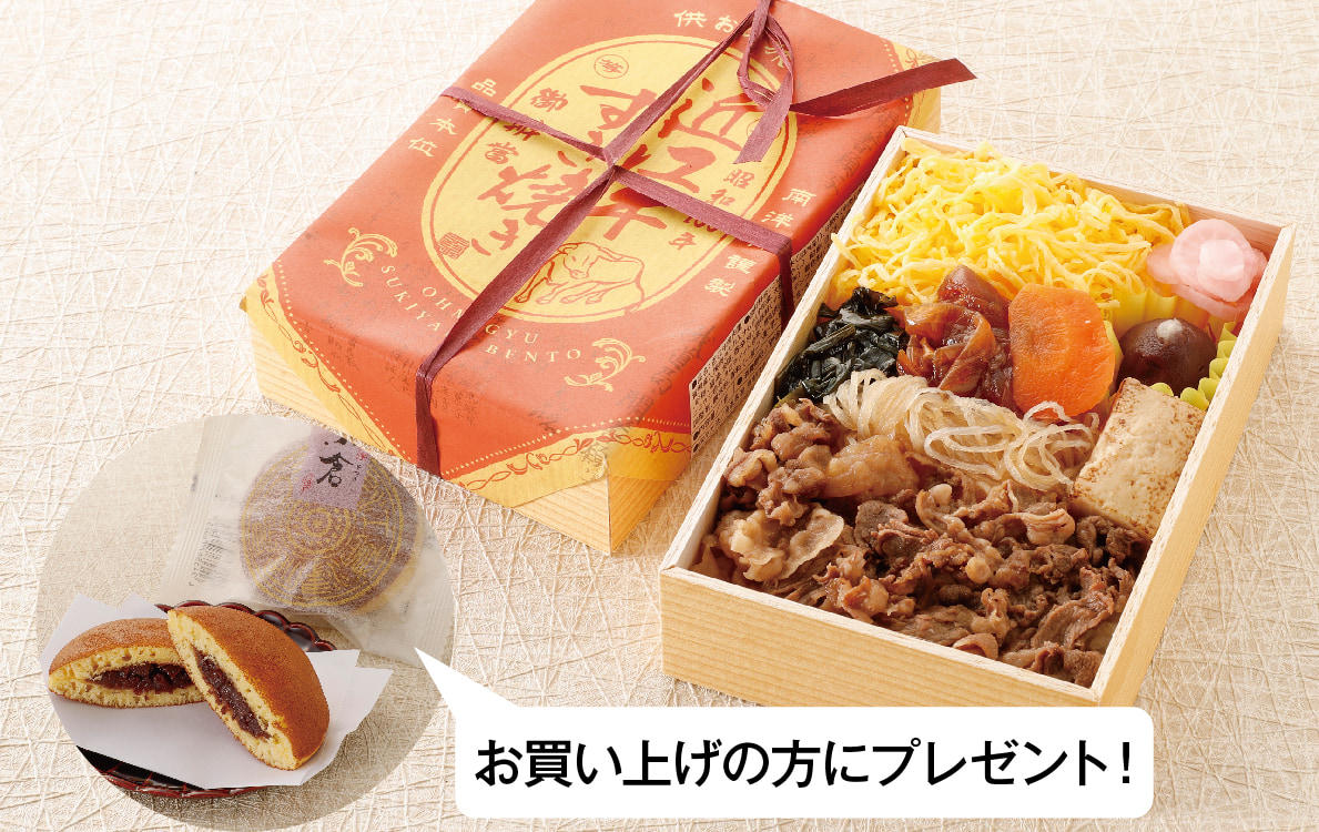 • 近江牛すき焼き弁当を昭和風復刻版に仕上げた新作駅弁。昭和100年近江牛すき焼き上等辨當をお買上げの方に 宿場どらやきをプレゼント!