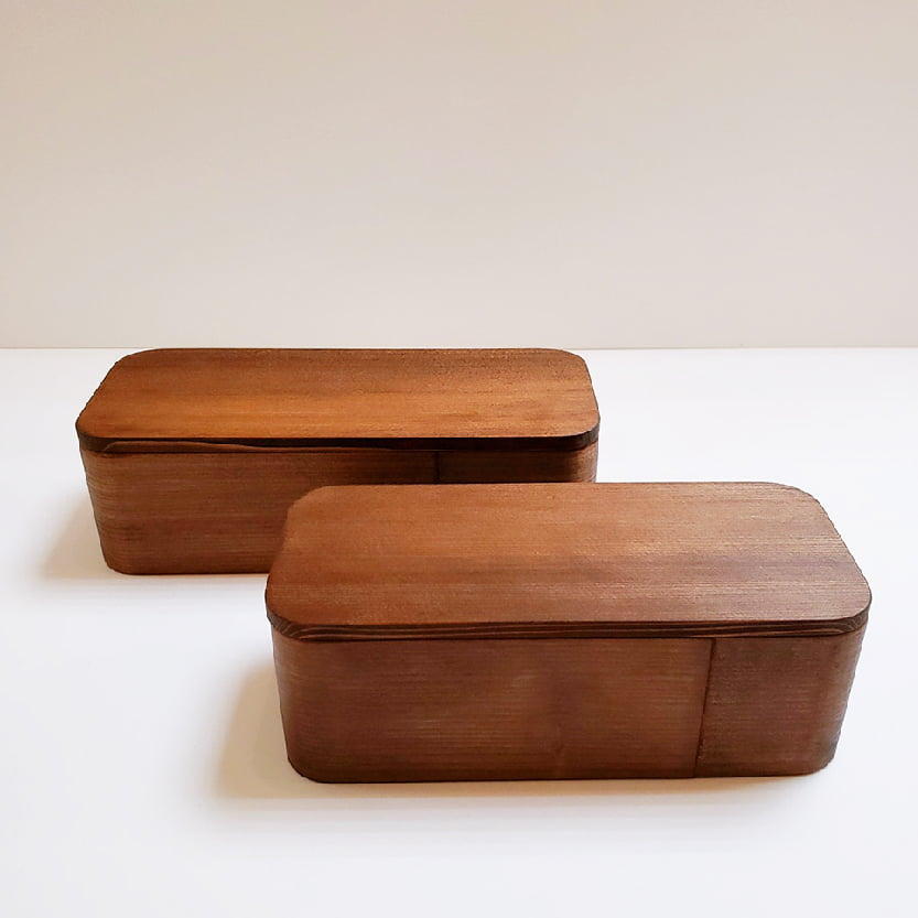 軽くて手触りがよい杉の木は調湿・断熱の性質があり、お弁当箱に詰めたご飯の余分な湿気を吸収して、おひつに入れたご飯のようにふっくらとおいしい状態を保つことができます。洗いやすく、乾きが早く、抗菌作用もある拭き漆仕上げで色やにおい移りを防いでくれ、お弁当の傷みが心配な夏場にも安心してお使いいただけます。