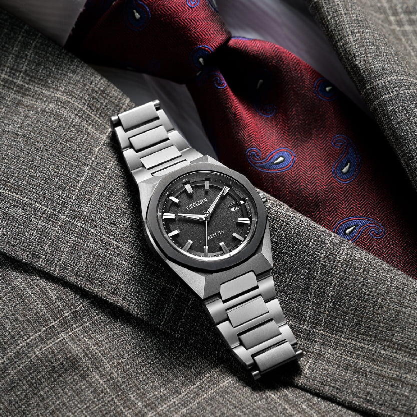 ……………………………… (税込)99,000円 - 強い個性を演出する八角形のベゼルの頂点と、アテッサらしい直線的な稜線を合わせた美しいケースのフォルムが特徴的です。文字板は、ザラっとした質感でチタニウムの原石をイメージ。立体感を演出する上板とインデックスに、メタリックな見返しリングを組み合わせた3体構造で、シンプルな中にもソリッドな印象と力強さを感じさせる仕上がりです。 2025年グッドデザイン賞受賞。