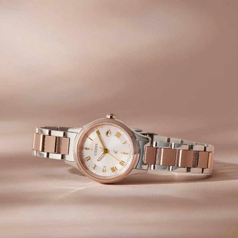 ……………………………… (税込)99,000円 - 文字板12時、6時、9時位置には、差し込む光をイメージして、ひし形と丸型2種のカットパーツをセッティングしています。ウォームゴールドの輝きがフェミニンな優しさを演出します。ガラスには、持ち主の幸せを願い、お守りとなるよう想いを込めた“光の粒”=ミルグレインリングを、レーザー加工で表現しました。集めた光を放つかのように、シンプルながらも、動くたびにキラっと輝く美しいデザインです。