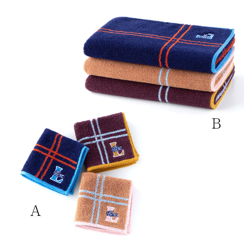 …………………………… (税込)各2,750円 - バレンタインのチョコに添えて、ラコステのアパレルデザインをアレンジし、トレンドカラーでまとめました。 カジュアルかつスタイリッシュなデザインが特徴です。アクセントカラーを使用したデザインと、「L」と「ワニ」を組み合わせた新鮮な刺繍がポイントです。定番のチェック柄でありながらカラーコンビネーションがラコステらしいファッショナブルなタオルは、幅広い世代におすすめです。