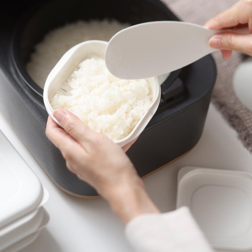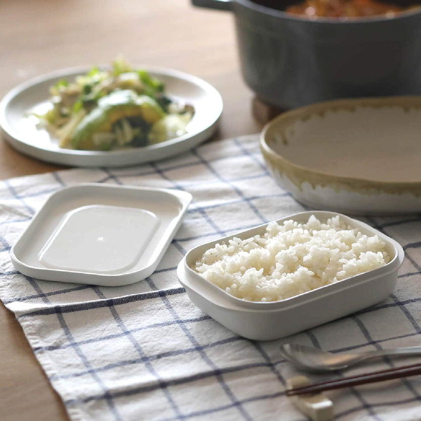 …………………… (税込)968円 - 炊き立てのようなおいしさを。全米販・お米マイスター徳永真悟氏共同企画。冷凍ご飯をムラなくふっくらと温められるかたちを極めた保存容器です。お手入れしやすく、収納性の良いシンプルなデザインです。