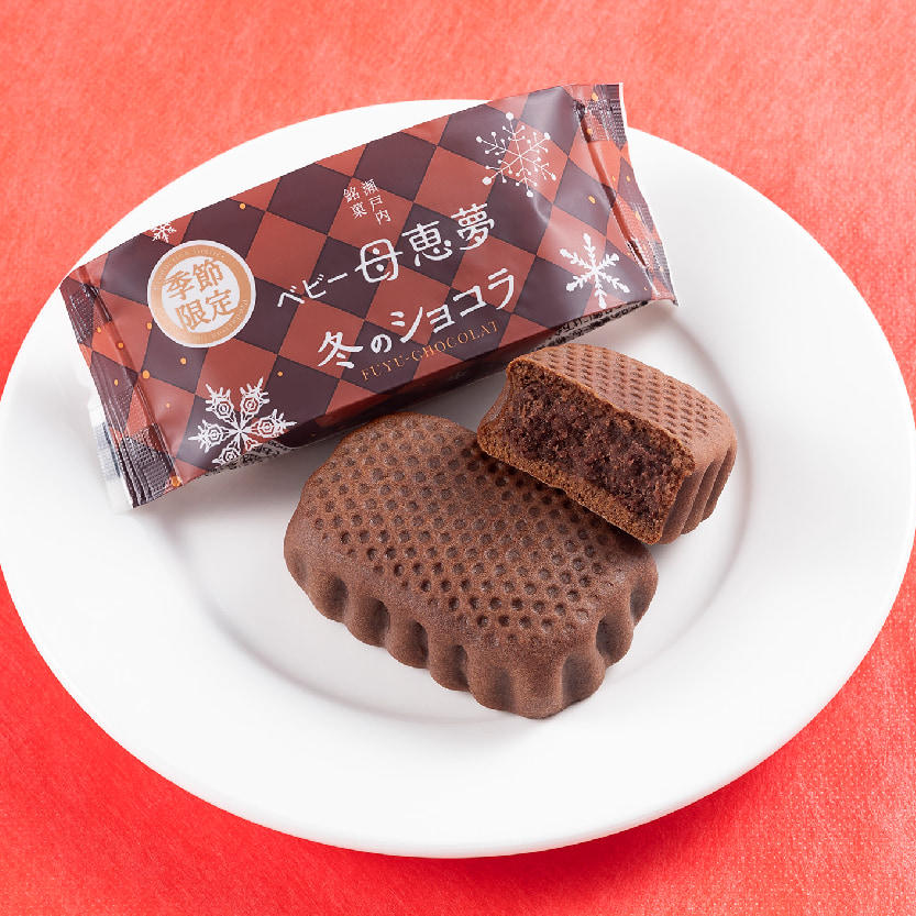 …………… (税込)800円 - ショコラの贅沢な味わいを生かした冬のベビー母恵夢。黄味あんには上質なショコラをブレンド、チョコの香りをまとった生地は、しっとりとした口どけです。柔らかく濃厚な味わいが人気の一品です。
