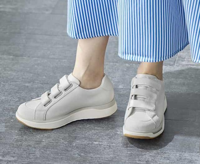 アッパーにはアクセントになる3本ベルトで着脱もスムーズ。カジュアルにもきれいめにも合わせやすいデザイン