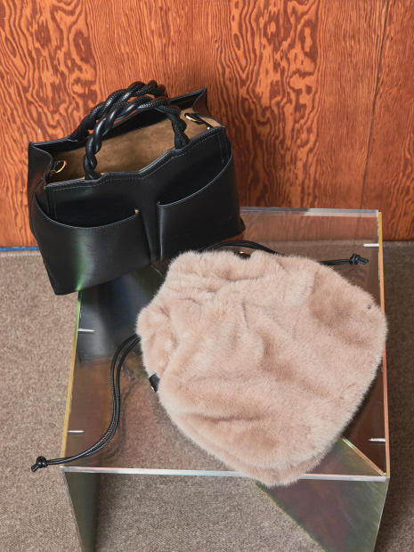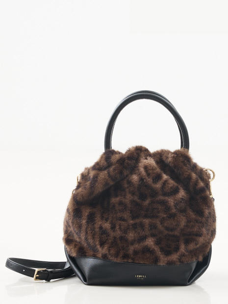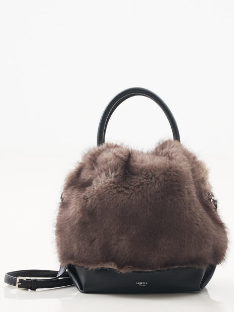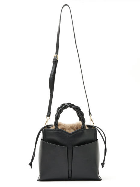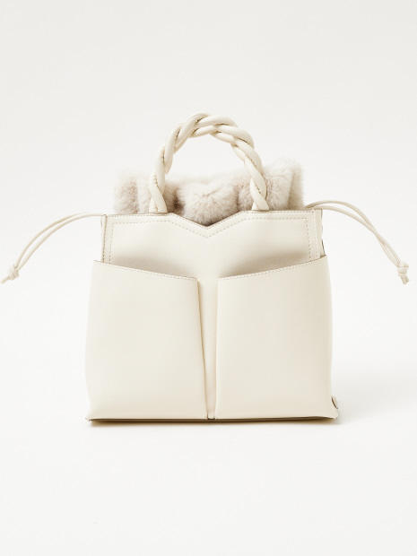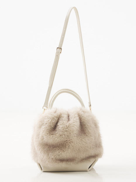 毛足の長い高級感のあるフェイクファーにギャザーを寄せ、ふんわりとボリューミーに仕上げたバケットバッグ
