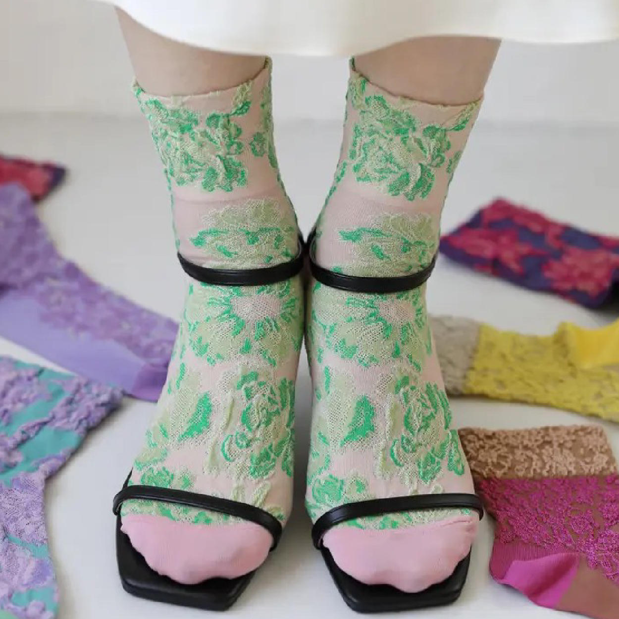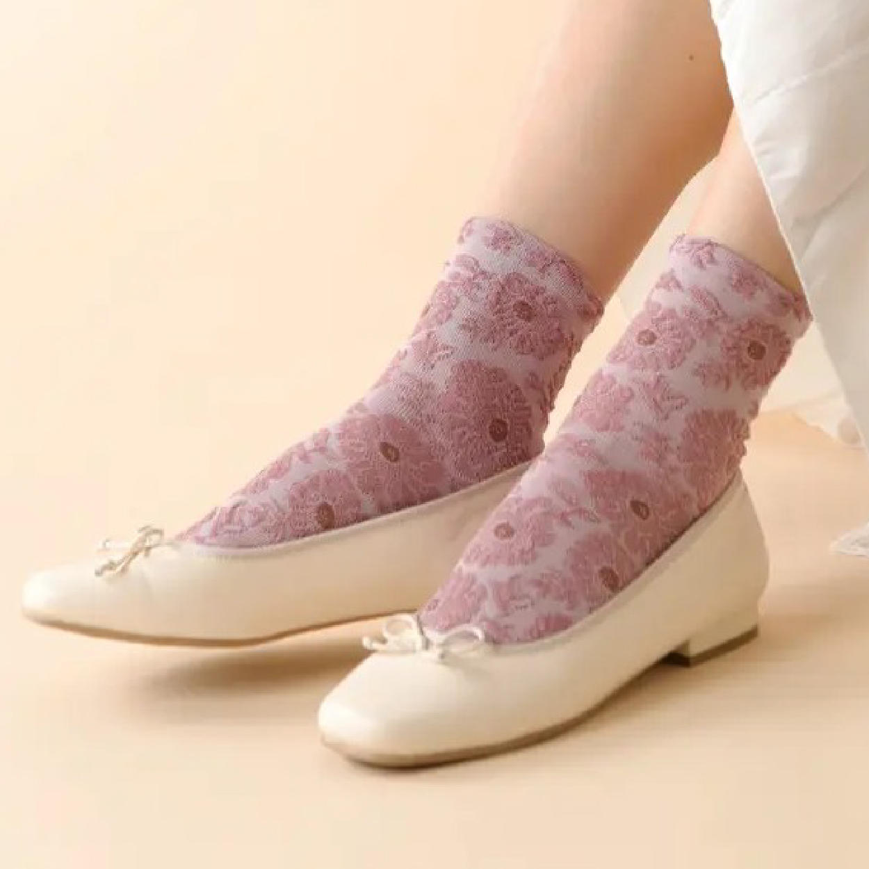 人気のソックスから新色ピンクが登場しました。上品な光沢感が特徴の綿シルケット素材を使用した、大きな花柄のフロート編みソックスです