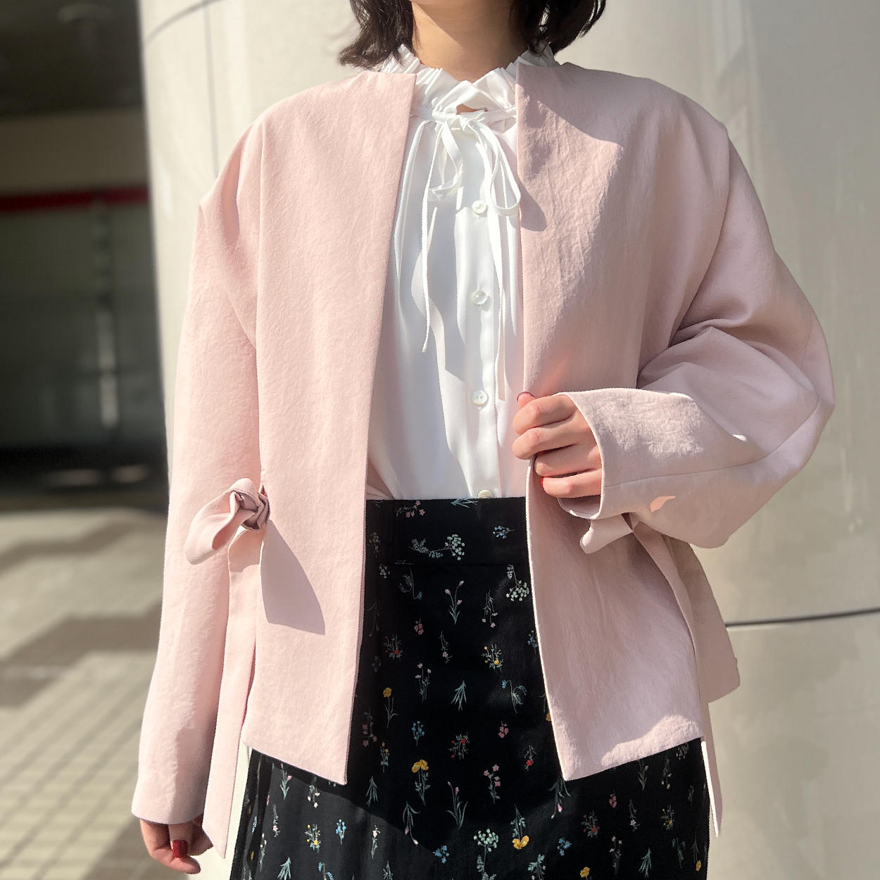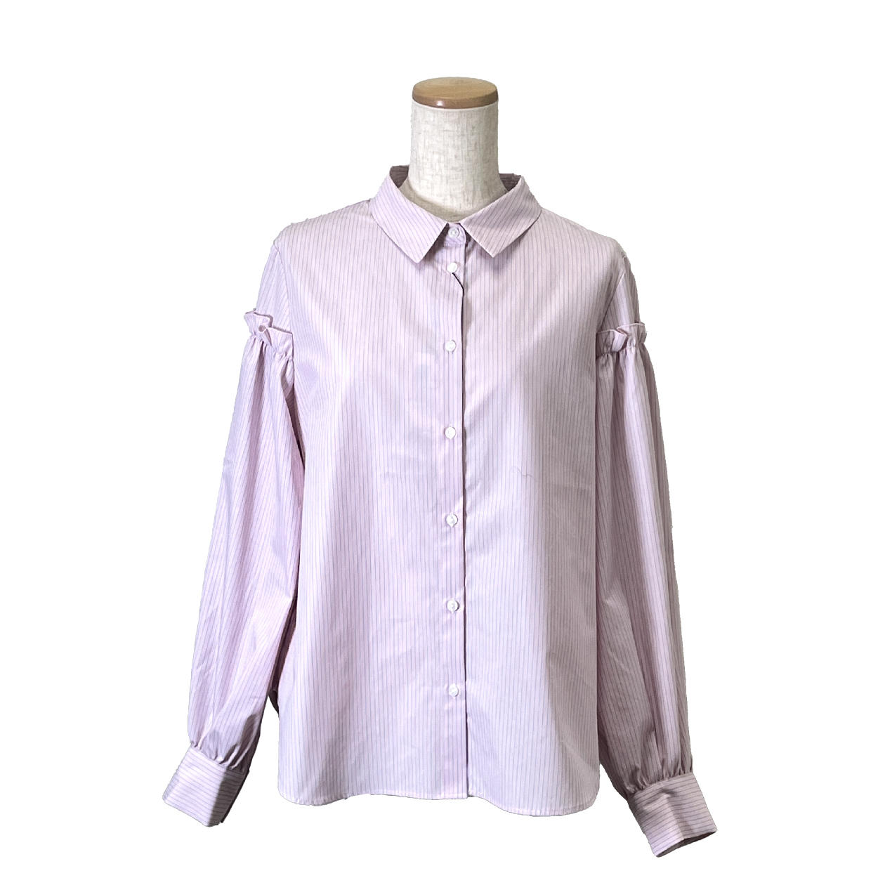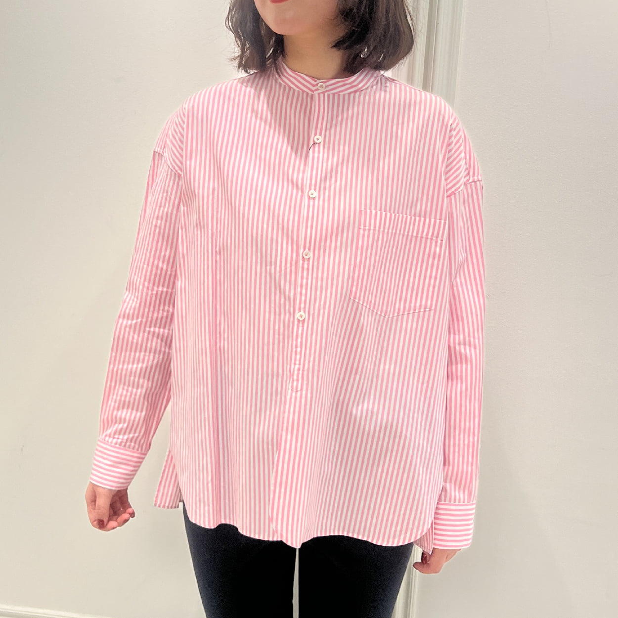 - ナチュラルかつ奥行きのある上品なノーカラーシャツ。白とピンクの絶妙なコントラストで上品に透明感を与えてくれます。