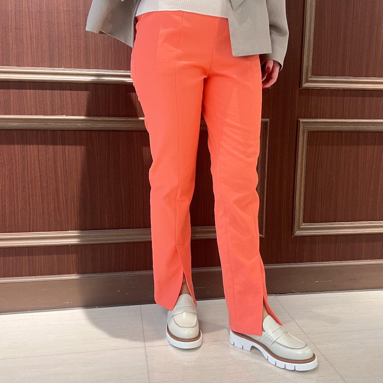 - 麻混のさらっとした素材感で脚のラインを拾いにくいストレートパンツ。サーモンピンクで甘すぎるのが苦手な方でも取り入れやすいお色です。