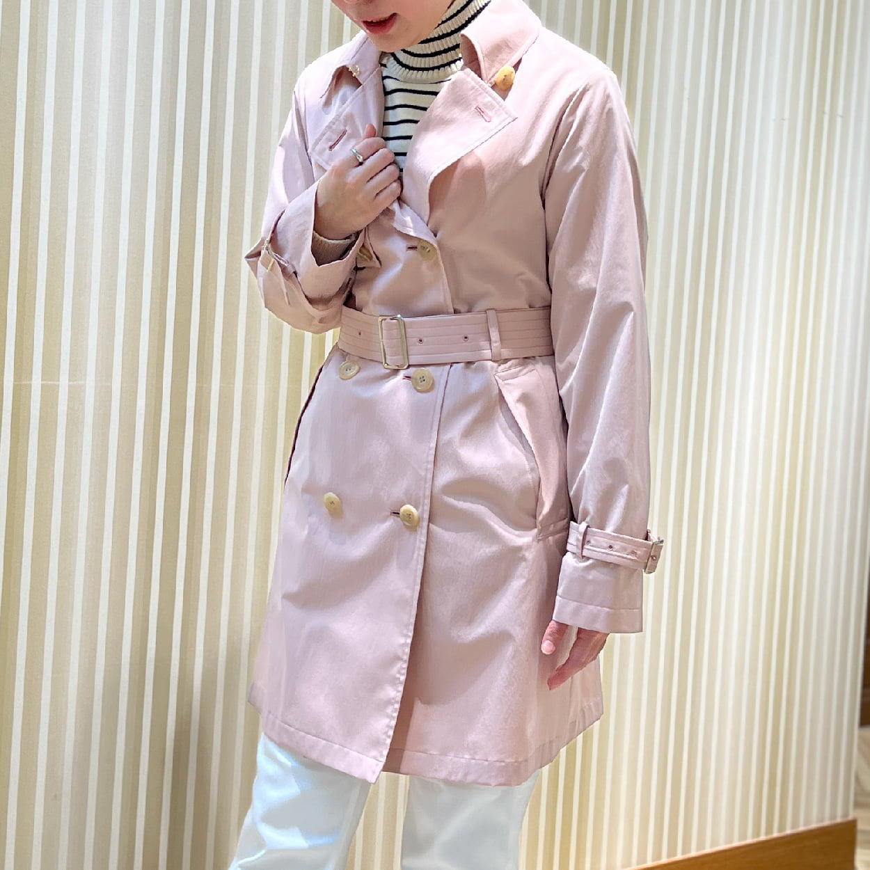 - 春らしさを感じさせる、淡いピンクのアウターを主役としたスプリングコーデ。 アウターは耐漏水試験の基準をクリアしている“晴雨兼用コート”で、雨の日でも気軽にお召しいただけます。