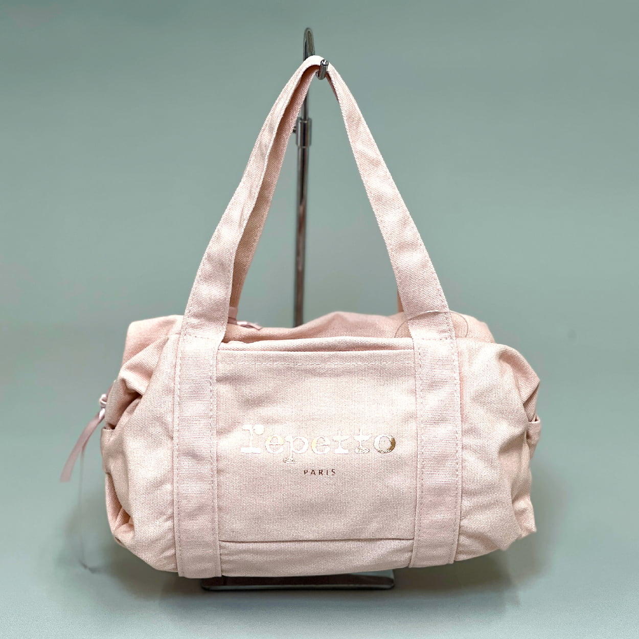 - 両サイドのリボンデザインがワンポイントのダッフルバック。repettoらしいベビーピンクの色味とデイリーで使いやすいデザインです。