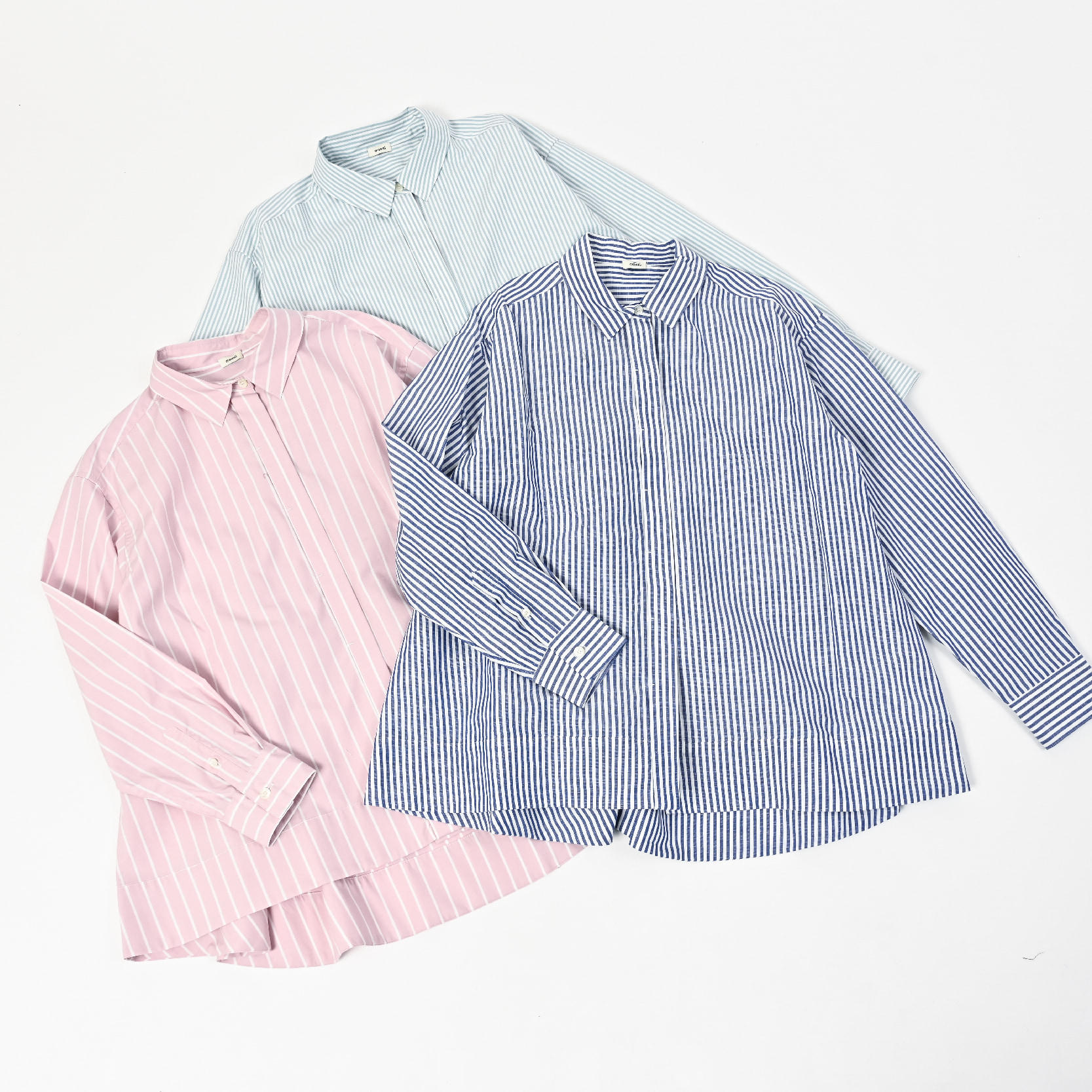 …………… 各(税込)28,600円 - 店頭でも人気のバックフレアーシャツに、春らしいカラーが新登場。後ろにボックスタックとたっぷりのフレアーが施されており、前はすっきりと、後ろはエレガントな印象に。