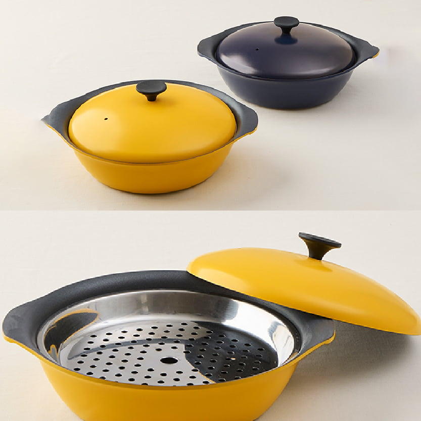 …………………………… 27㎝ (税込)14,300円 - アルミ製の鍋は一般的な土鍋よりも軽く、キッチンから食卓への持ち運び、洗い物や片付け等での負担が軽く扱いやすいため、気軽に鍋料理を楽しむことができます。できたての料理をそのまま食卓に出せる、シンプルなデザインも魅力のひとつです。
