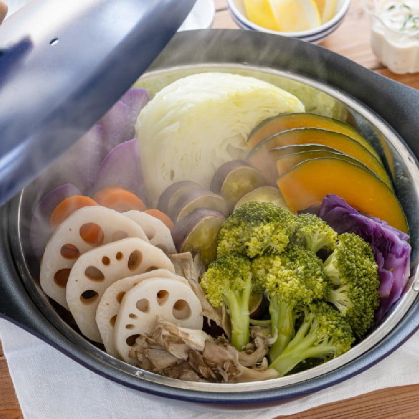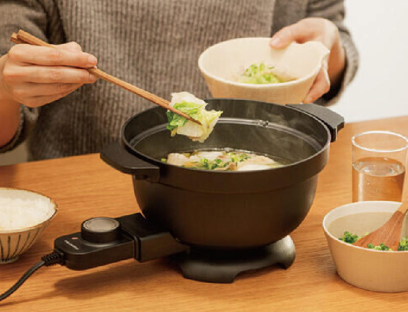 …………………………… (税込)7,150円 - 毎日の食卓で手軽に使える、小さな卓上電気なべ。ころんとしたかわいい見た目ながら、これ1台で“煮る・炒める・炊く・蒸す・揚げる”の5役をこなす万能電気なべです。鍋とヒーターが一体になっているため、500Wという低消費電力ながら火力はしっかり。さらにフッ素樹脂コーティングで焦げ付きにくく、丸洗いできて後片付けもラクラク。暮らしにちょこっと寄り添って、ふだんの食事をおいしく彩ってくれる相棒です。
